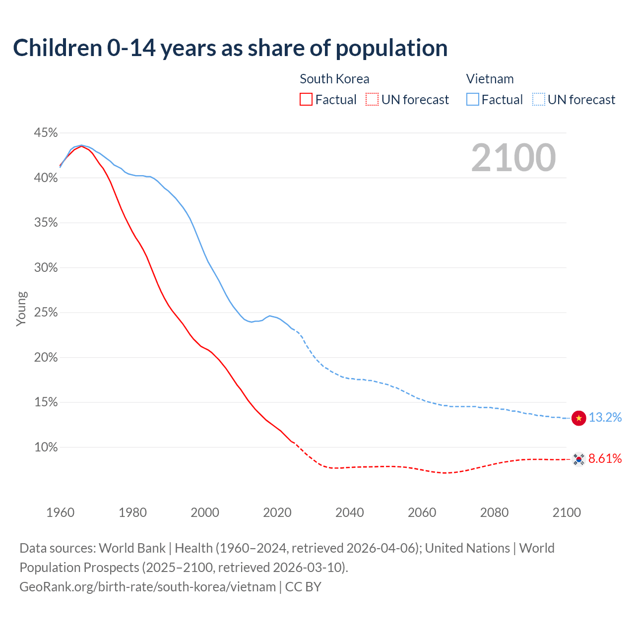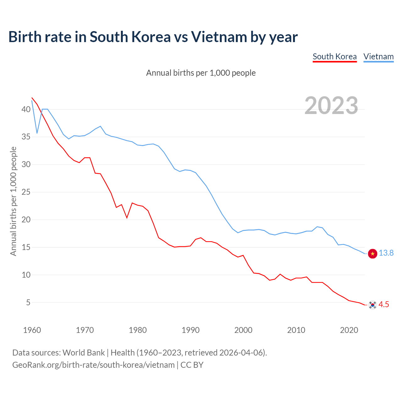According to the latest available data on birth rates, the fertility rate in South Korea was 0.72 children per woman in 2023, compared to 1.91 in Vietnam in 2023. The replacement level is considered to be 2.1 children per woman.