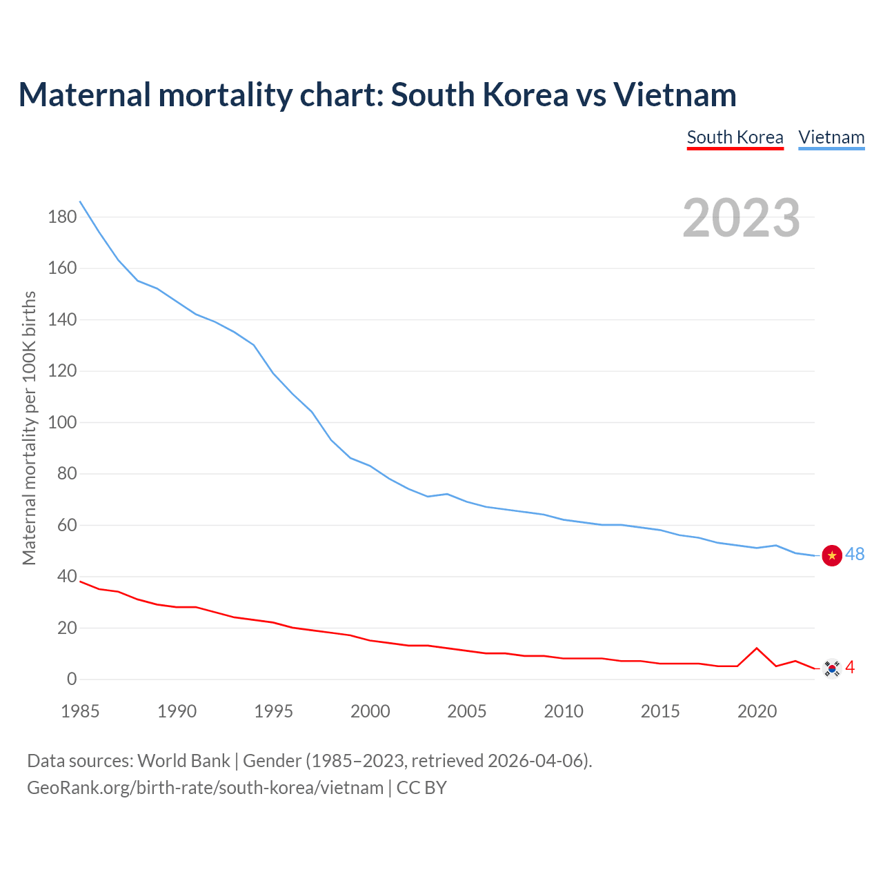 The maternal mortality rate, which is the probability of dying during childbirth or within 42 days of pregnancy termination, is 4 deaths per 100,000 live births in South Korea, compared to 48 deaths in Vietnam.