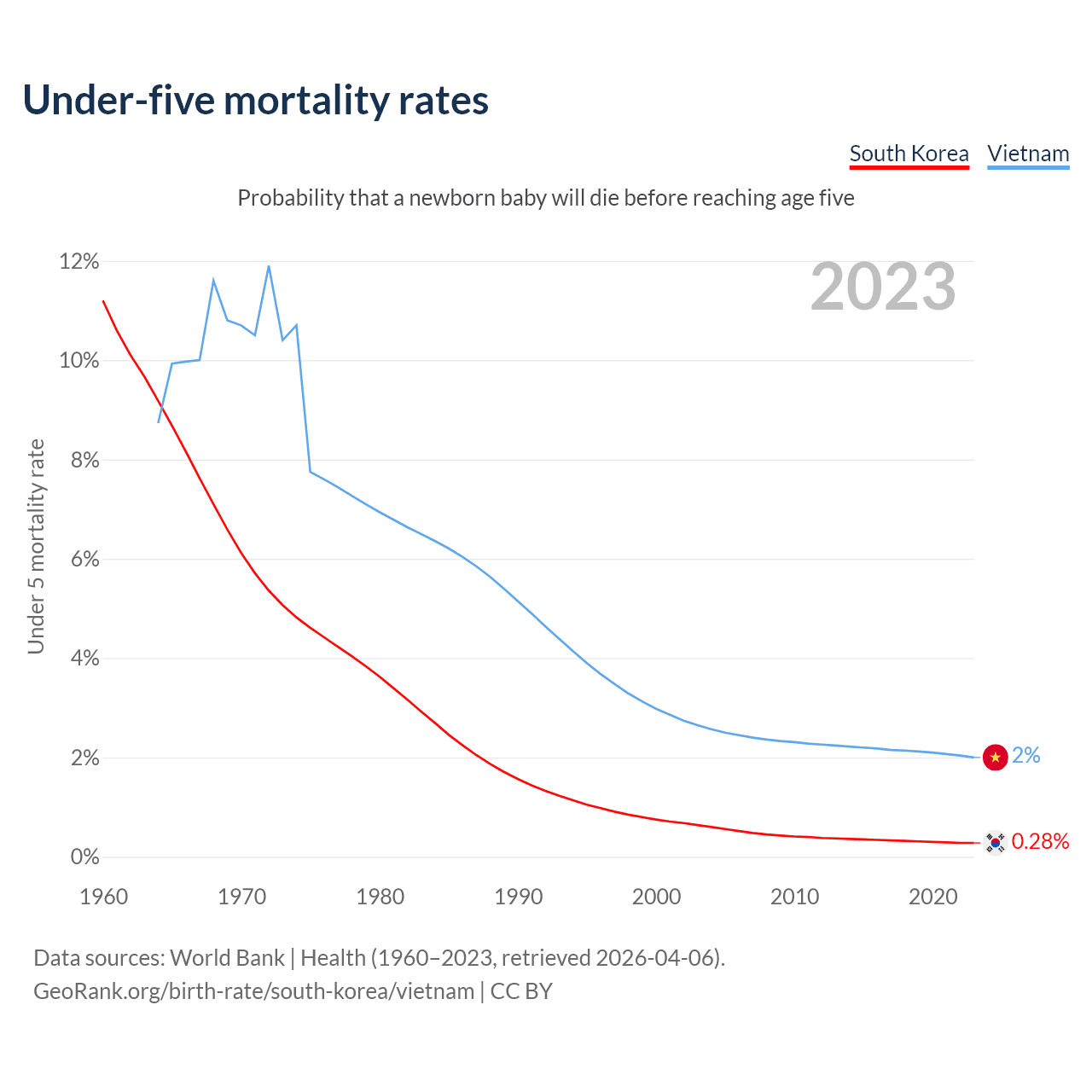 The chance that a newborn baby will die before reaching age five is 0.28% in South Korea and 2% in Vietnam. Above is a chart with historical data on under-five mortality rates.