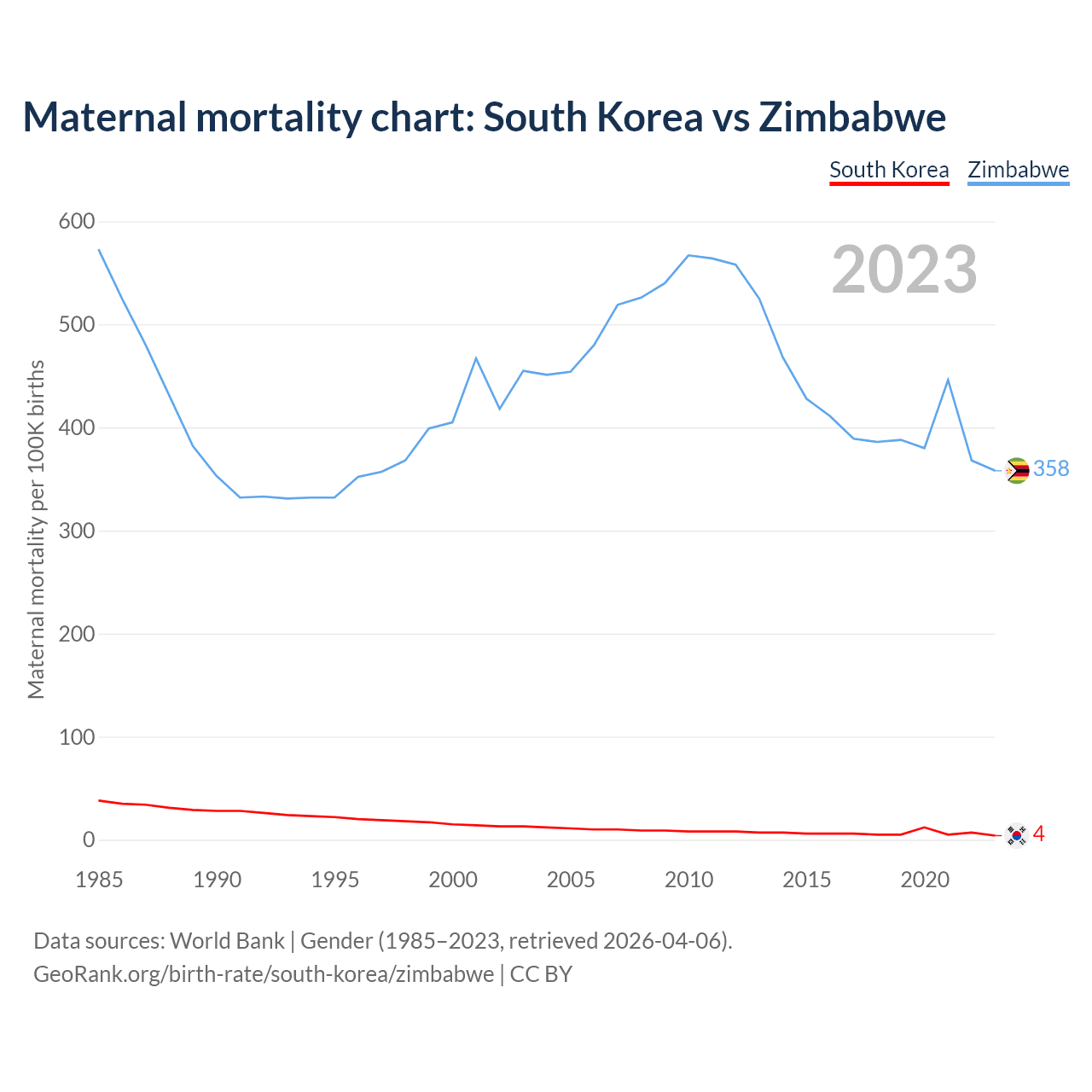 The maternal mortality rate, which is the probability of dying during childbirth or within 42 days of pregnancy termination, is 4 deaths per 100,000 live births in South Korea, compared to 358 deaths in Zimbabwe.