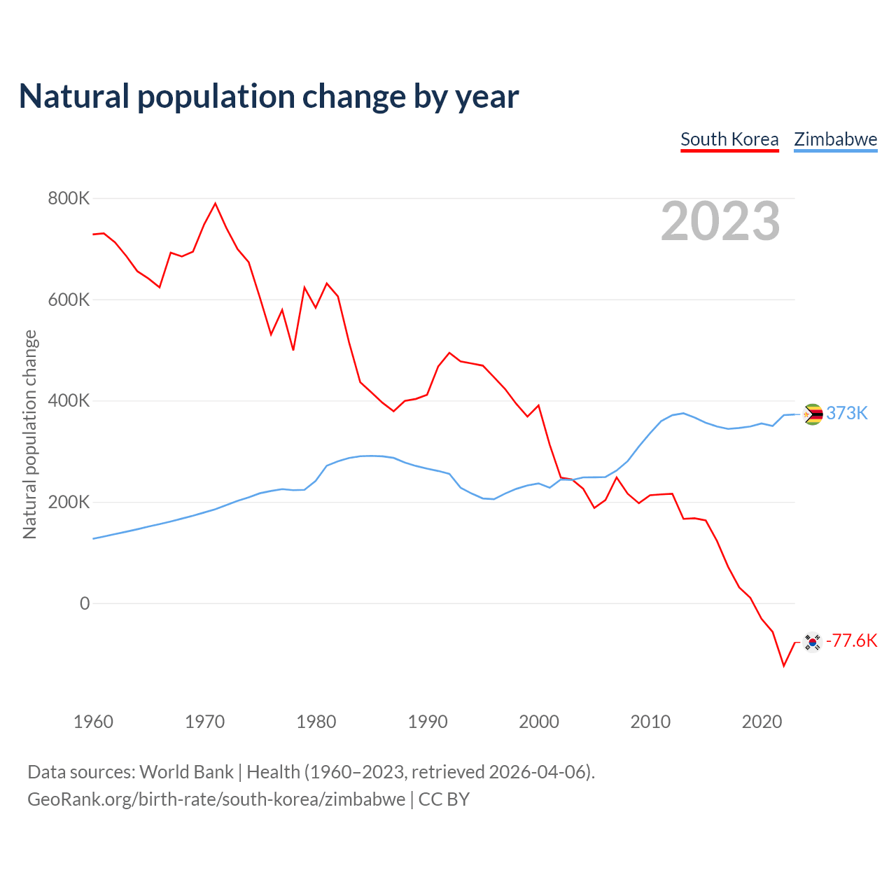 According to the latest available data on birth rates, the fertility rate in South Korea was 0.72 children per woman in 2023, compared to 3.72 in Zimbabwe in 2023. The replacement level is considered to be 2.1 children per woman.