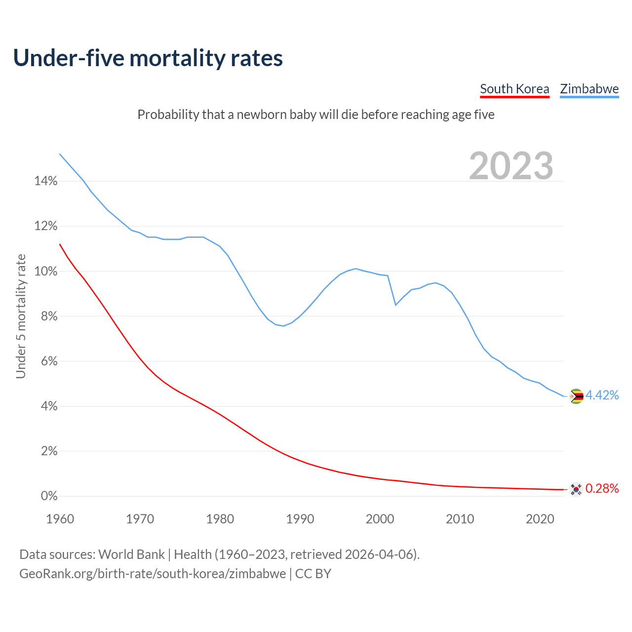 The chance that a newborn baby will die before reaching age five is 0.28% in South Korea and 4.42% in Zimbabwe. Above is a chart with historical data on under-five mortality rates.