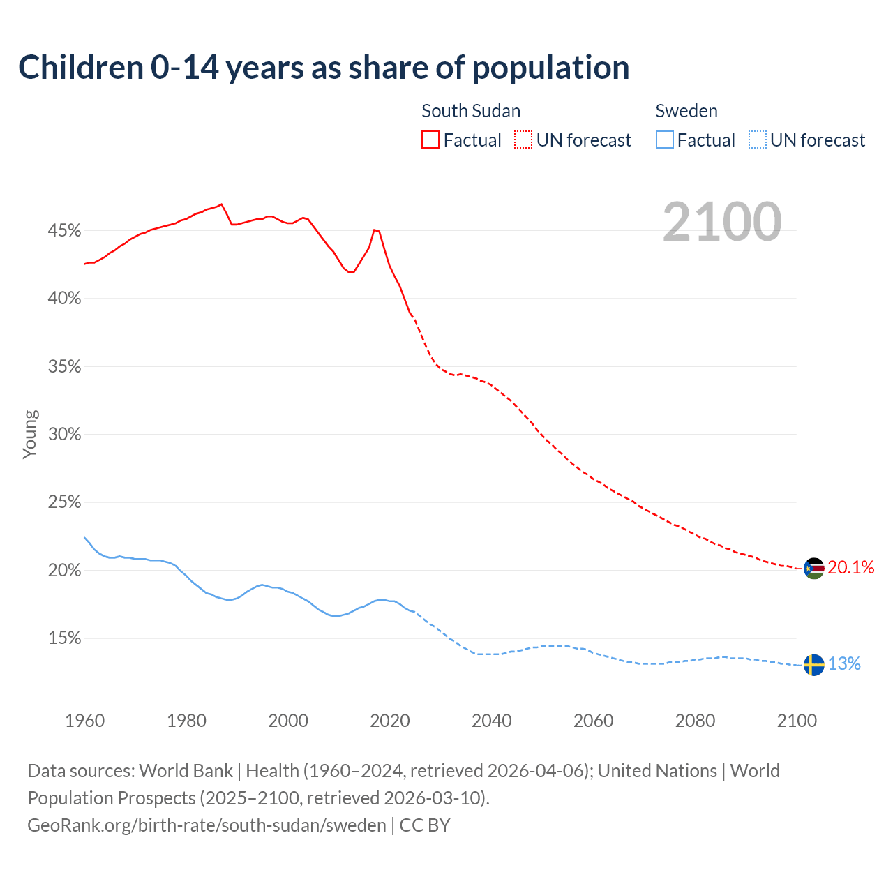 According to the latest available data on birth rates, the fertility rate in South Sudan was 3.86 children per woman in 2023, compared to 1.45 in Sweden in 2023. The replacement level is considered to be 2.1 children per woman.