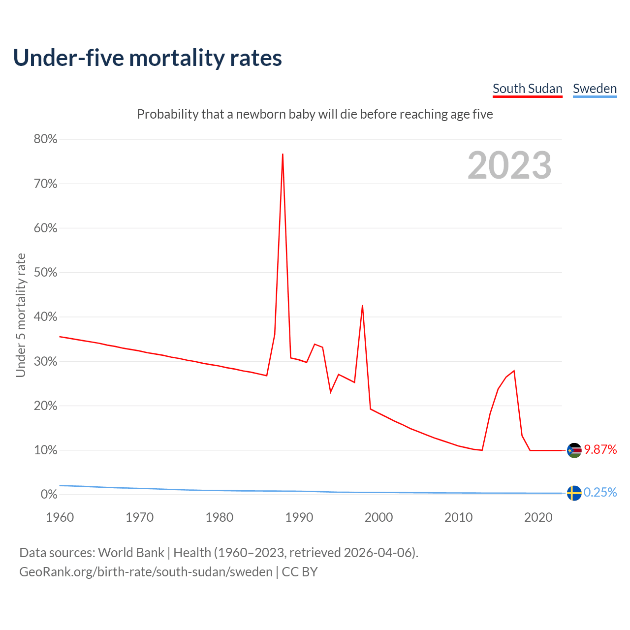 The chance that a newborn baby will die before reaching age five is 9.87% in South Sudan and 0.25% in Sweden. Above is a chart with historical data on under-five mortality rates.