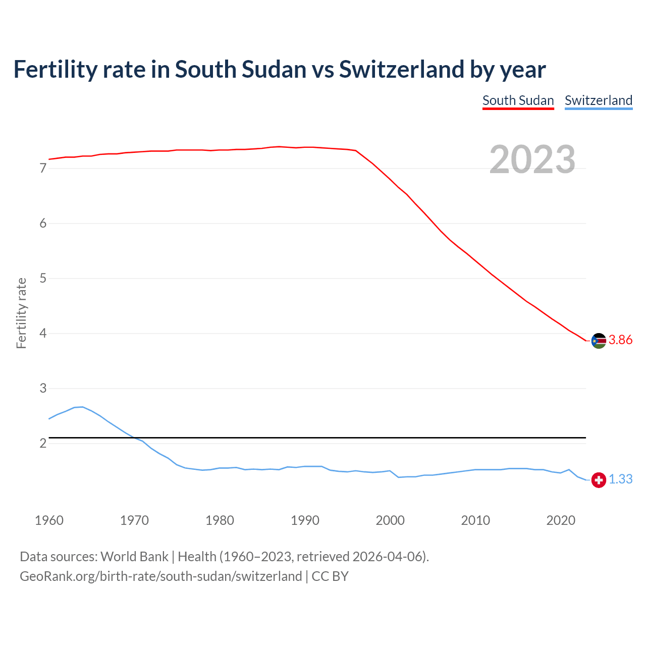According to the latest available data on birth rates, the fertility rate in South Sudan was 3.86 children per woman in 2023, compared to 1.33 in Switzerland in 2023. The replacement level is considered to be 2.1 children per woman.