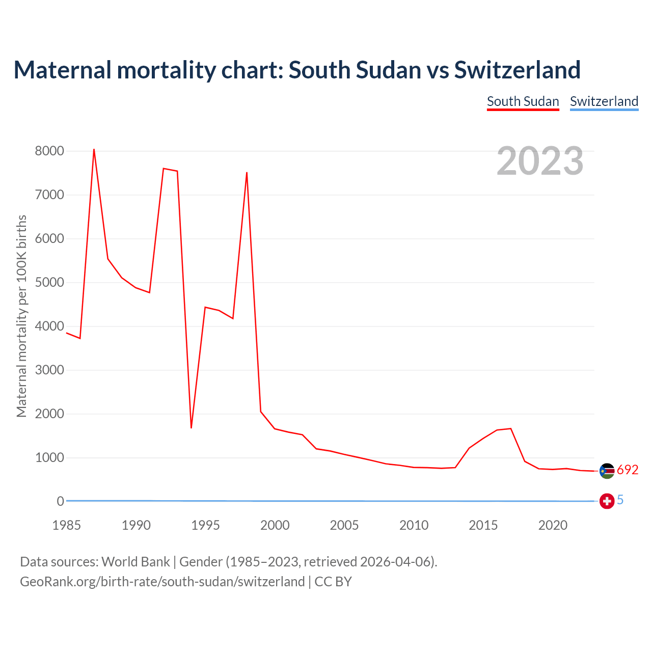 The maternal mortality rate, which is the probability of dying during childbirth or within 42 days of pregnancy termination, is 692 deaths per 100,000 live births in South Sudan, compared to 5 deaths in Switzerland.