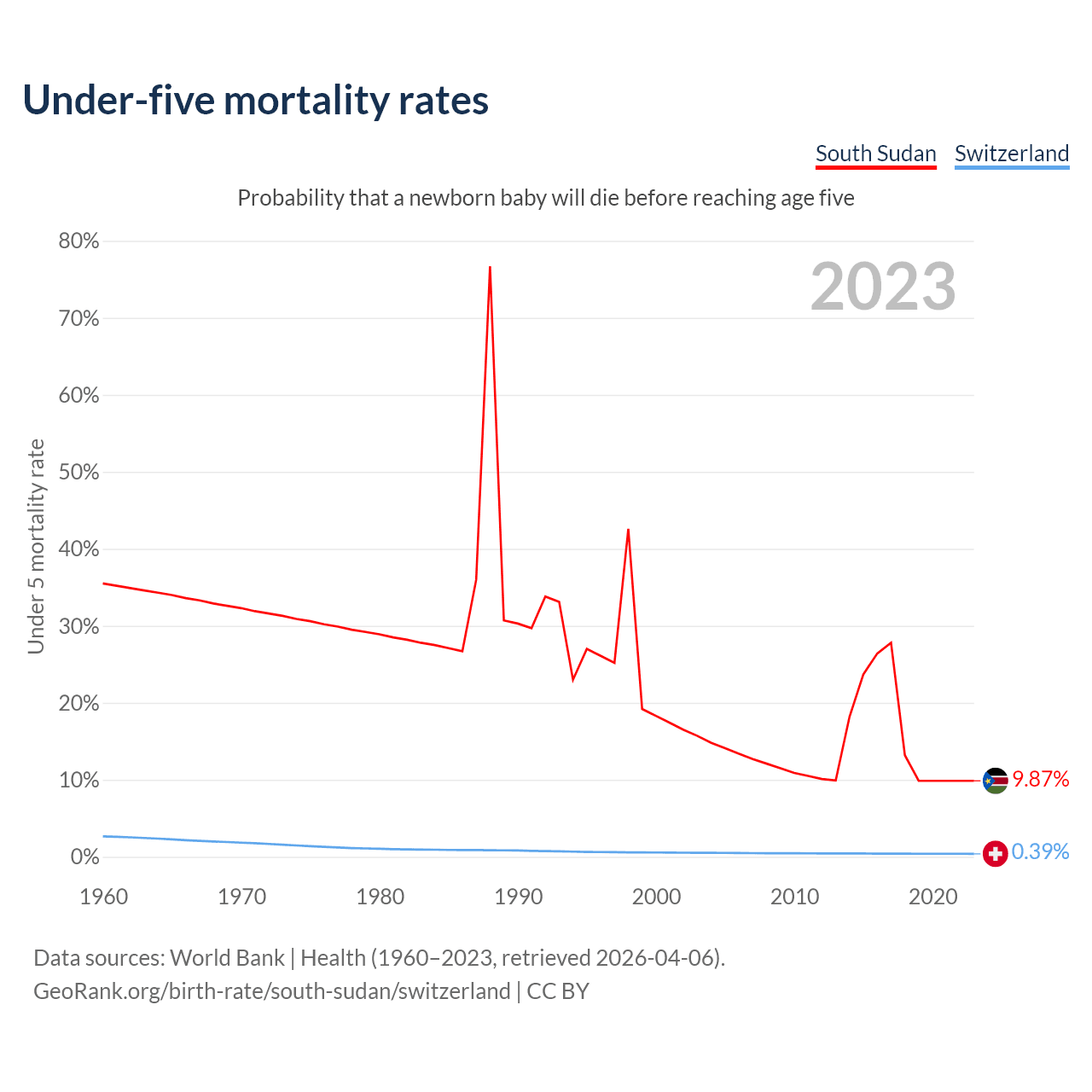 The chance that a newborn baby will die before reaching age five is 9.87% in South Sudan and 0.39% in Switzerland. Above is a chart with historical data on under-five mortality rates.