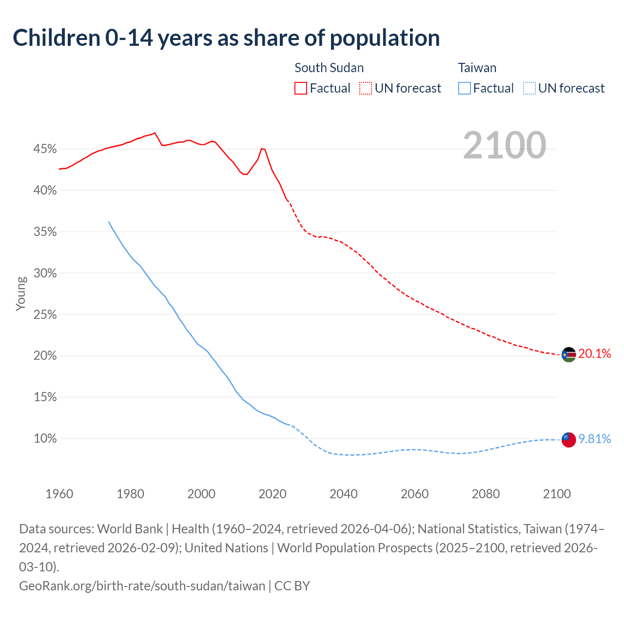 South Sudan has an annual birth rate of 28.6 births per 1,000 people, compared to 5.76 for Taiwan. The average number of children a woman is expected to have during her lifetime — the fertility rate, is 3.86 in South Sudan and 0.89 in Taiwan — 77.1% difference.