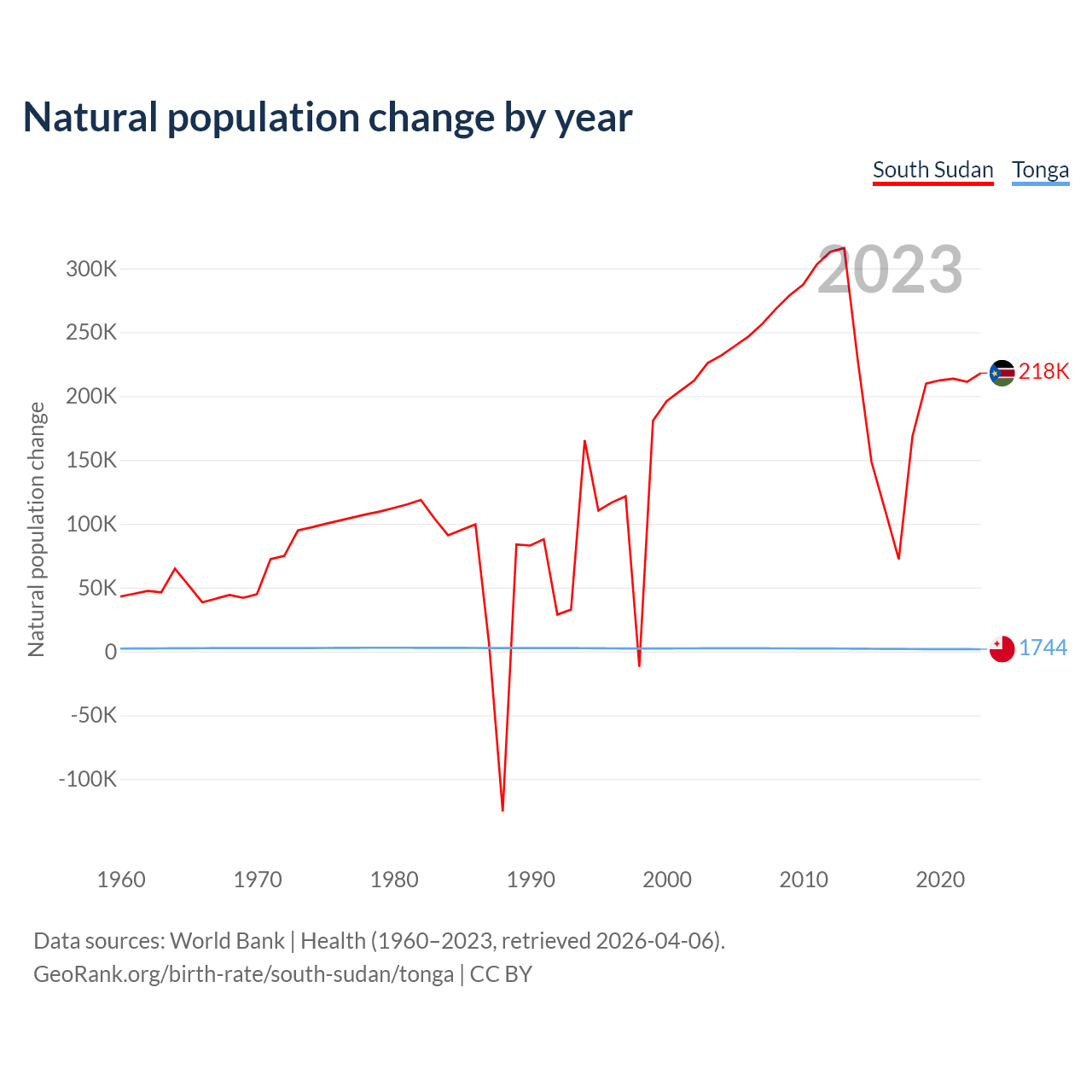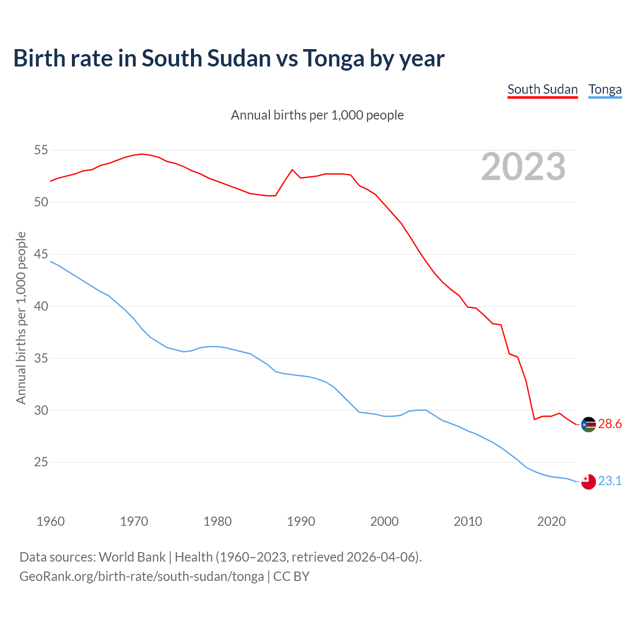 South Sudan has an annual birth rate of 28.6 births per 1,000 people, compared to 23.1 for Tonga. The average number of children a woman is expected to have during her lifetime — the fertility rate, is 3.86 in South Sudan and 3.13 in Tonga — 19% difference.