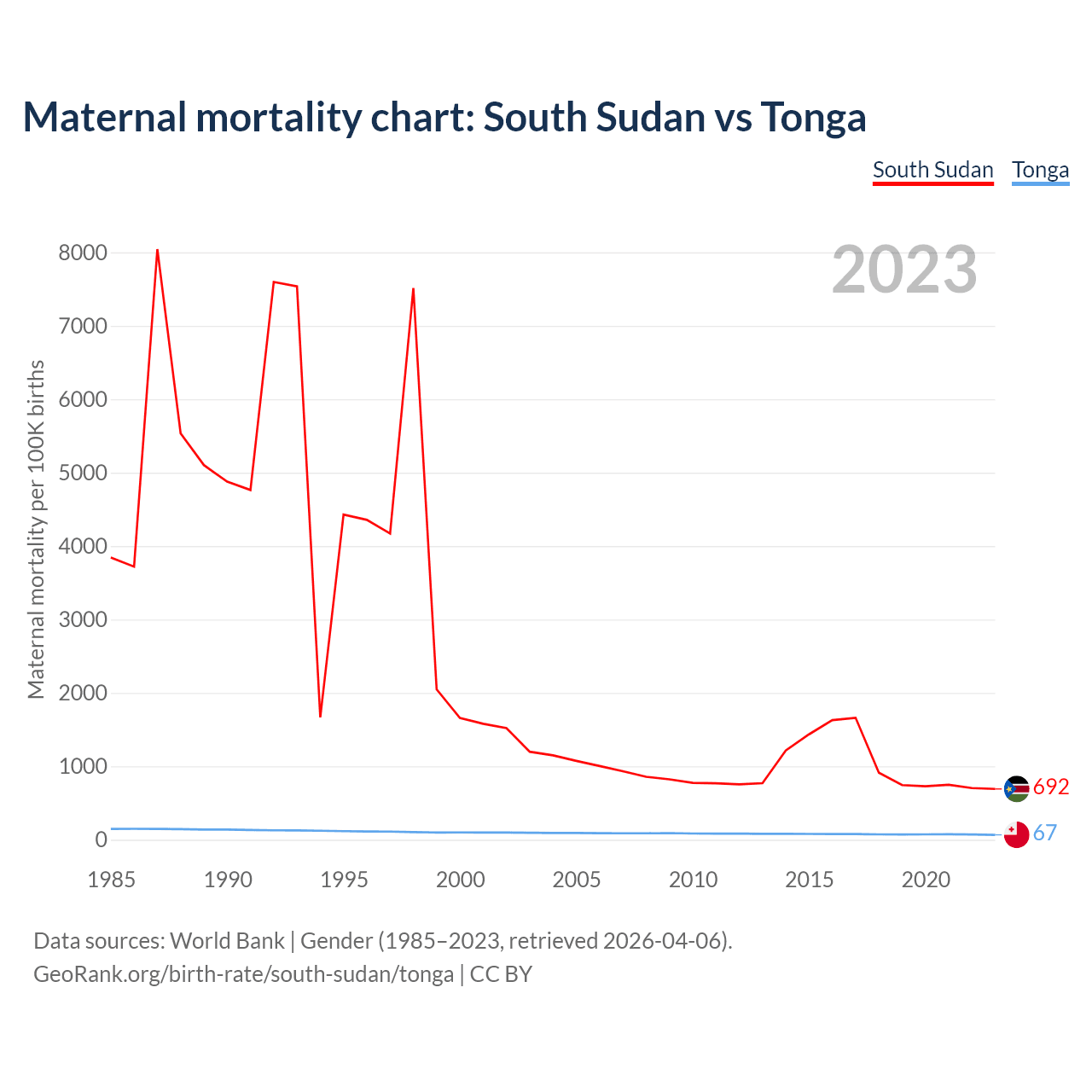 The maternal mortality rate, which is the probability of dying during childbirth or within 42 days of pregnancy termination, is 692 deaths per 100,000 live births in South Sudan, compared to 67 deaths in Tonga.