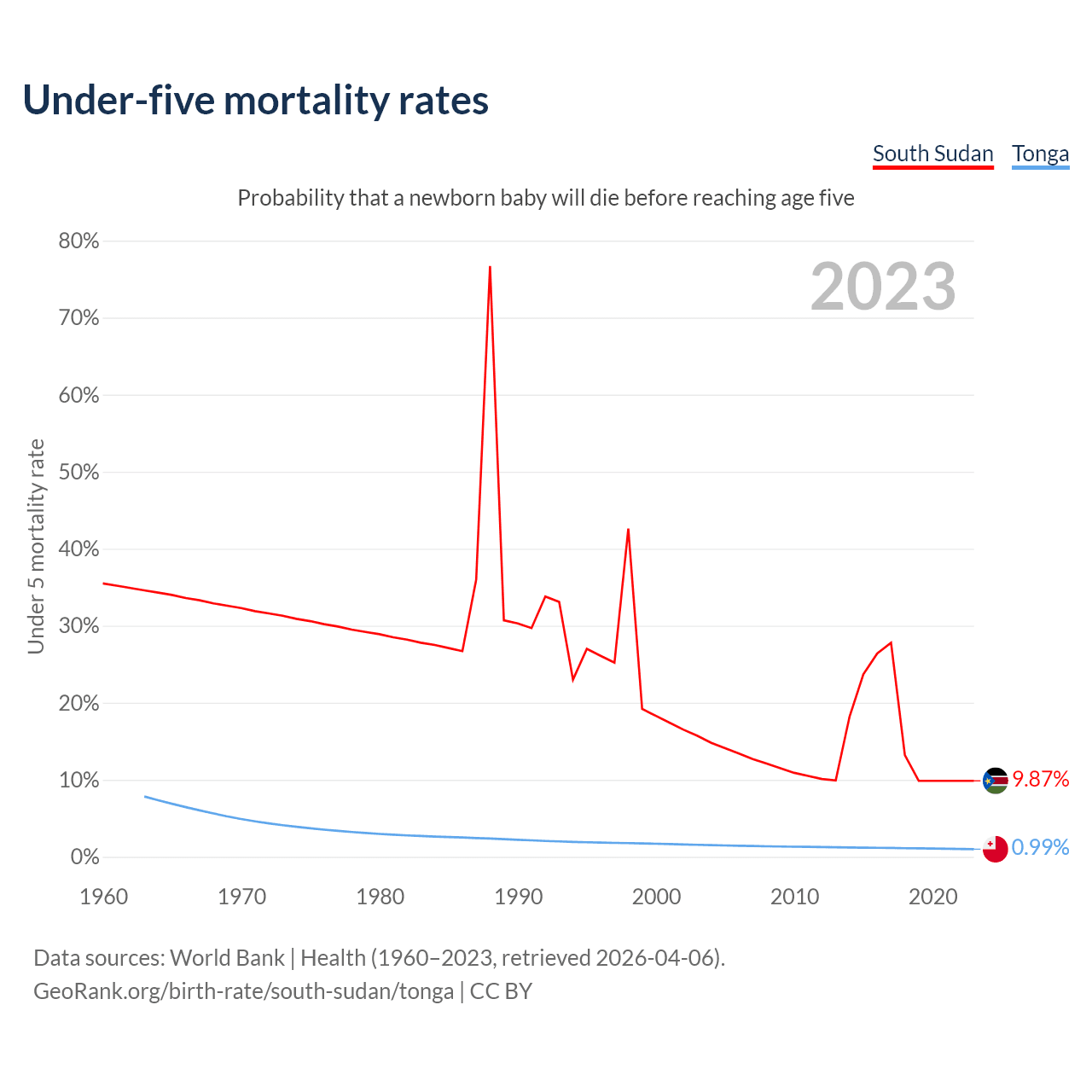 The chance that a newborn baby will die before reaching age five is 9.87% in South Sudan and 0.99% in Tonga. Above is a chart with historical data on under-five mortality rates.