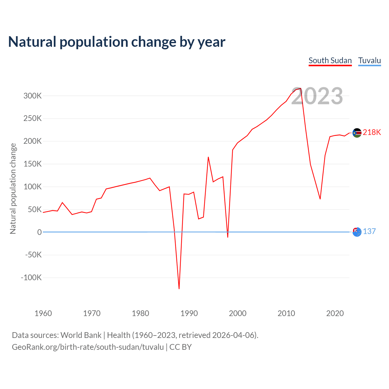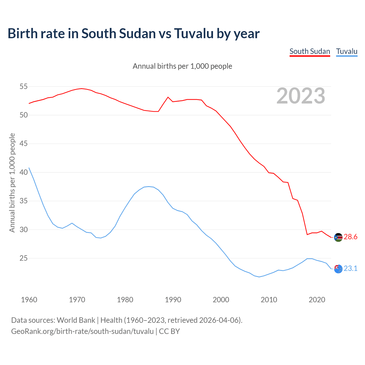 South Sudan has an annual birth rate of 28.6 births per 1,000 people, compared to 23.1 for Tuvalu. The average number of children a woman is expected to have during her lifetime — the fertility rate, is 3.86 in South Sudan and 3.21 in Tuvalu — 17% difference.