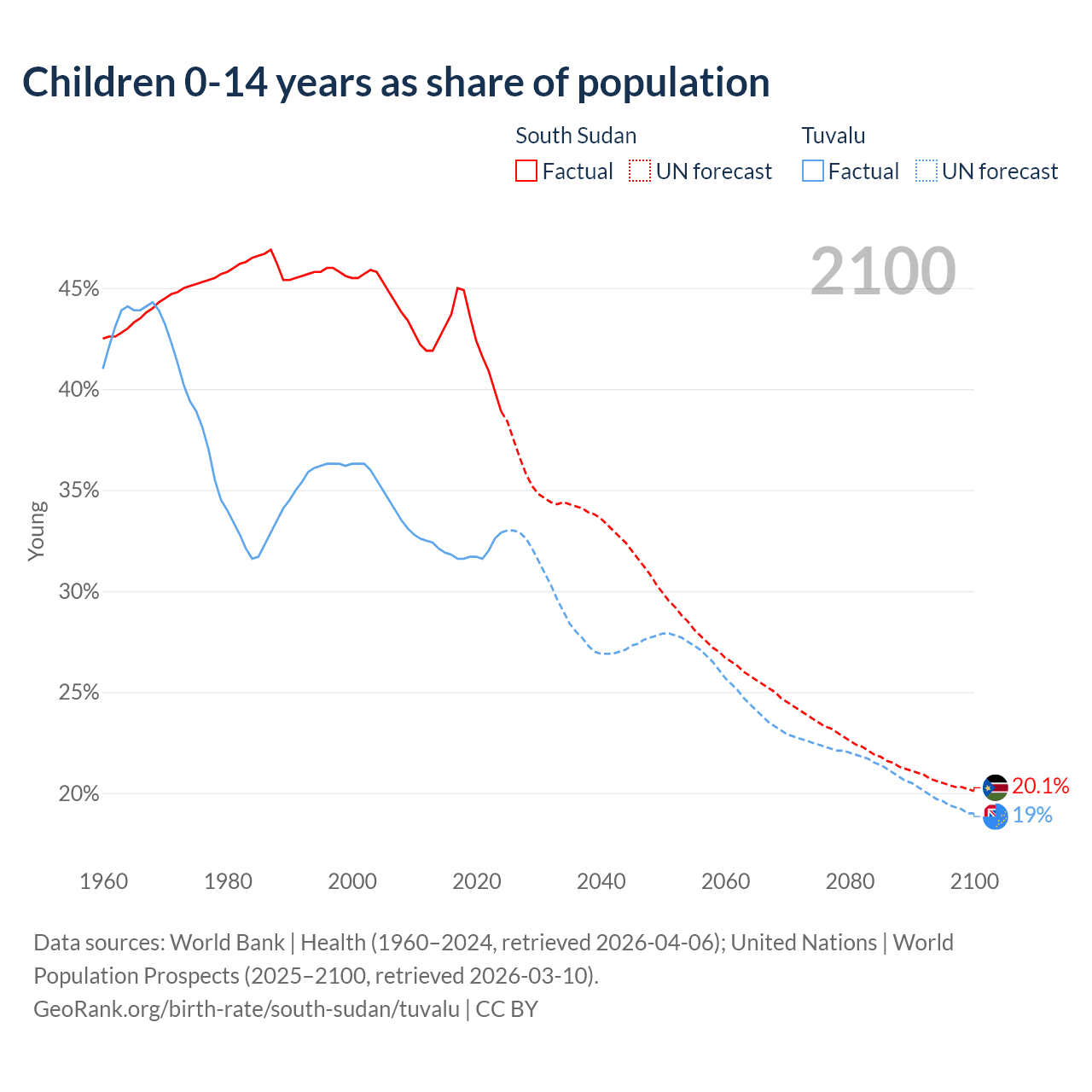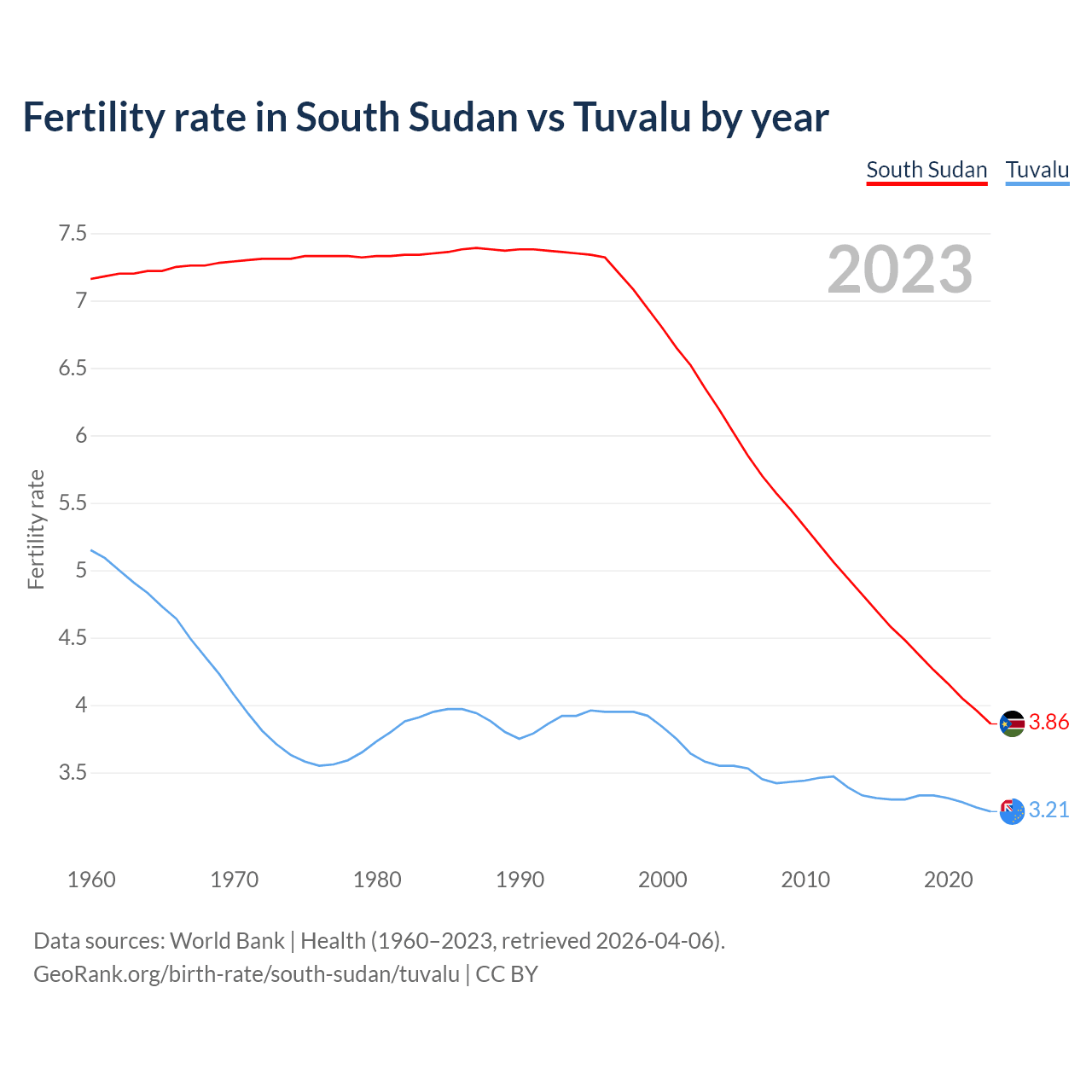 According to the latest available data on birth rates, the fertility rate in South Sudan was 3.86 children per woman in 2023, compared to 3.21 in Tuvalu in 2023. The replacement level is considered to be 2.1 children per woman.