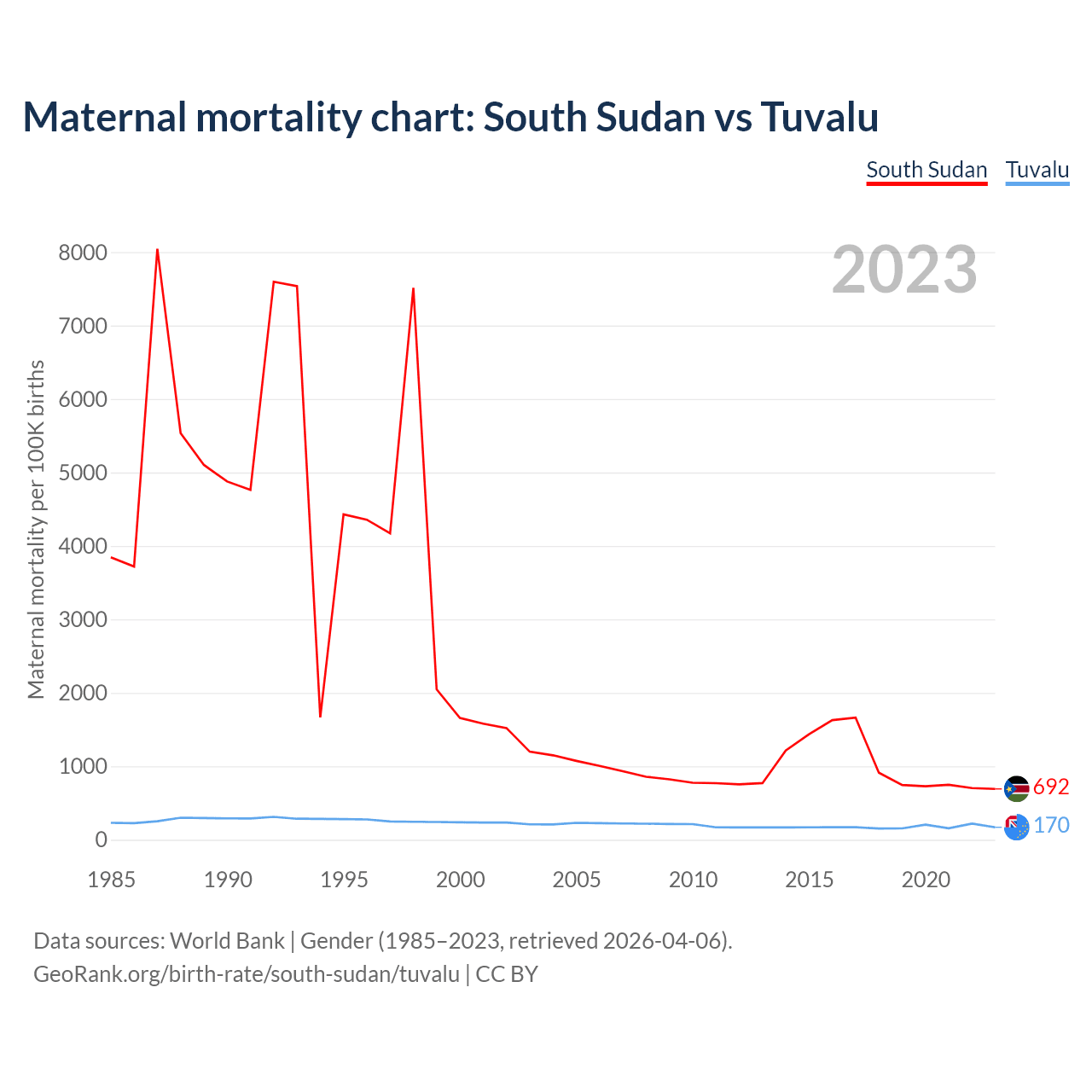 The maternal mortality rate, which is the probability of dying during childbirth or within 42 days of pregnancy termination, is 692 deaths per 100,000 live births in South Sudan, compared to 170 deaths in Tuvalu.