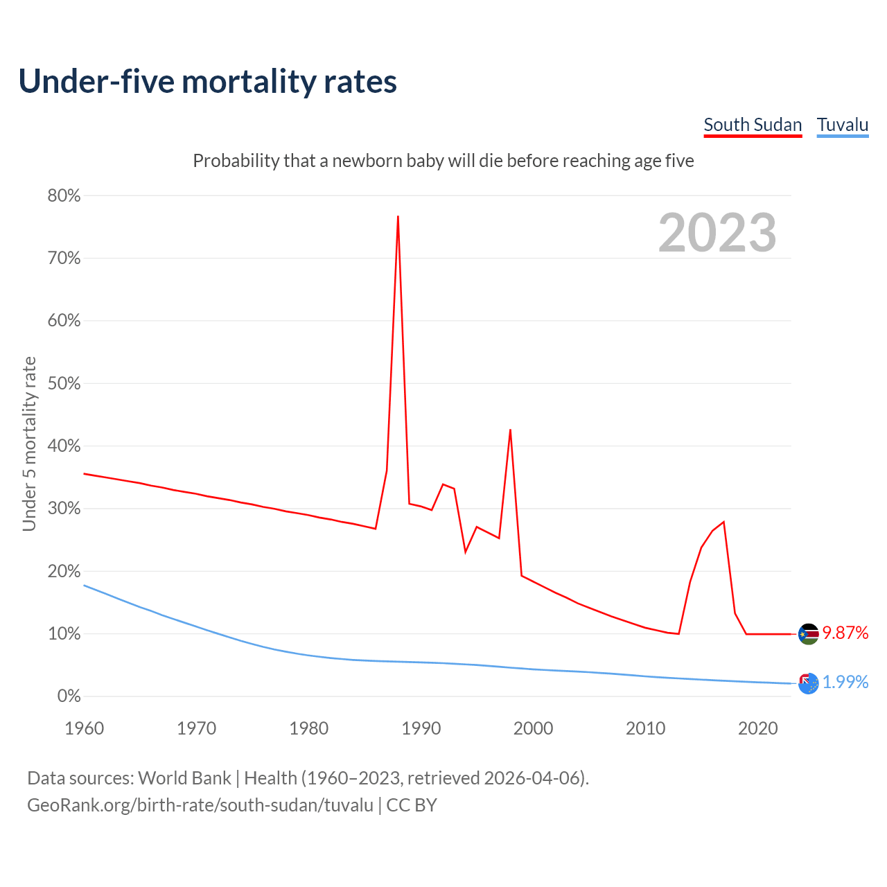 The chance that a newborn baby will die before reaching age five is 9.87% in South Sudan and 1.99% in Tuvalu. Above is a chart with historical data on under-five mortality rates.
