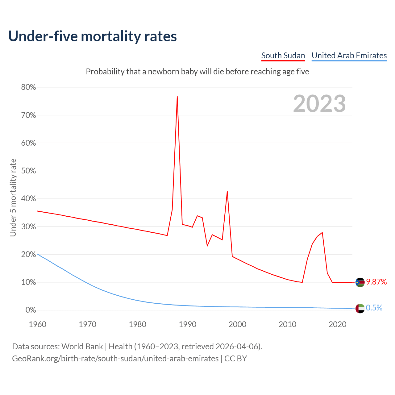 The chance that a newborn baby will die before reaching age five is 9.87% in South Sudan and 0.5% in the United Arab Emirates. Above is a chart with historical data on under-five mortality rates.