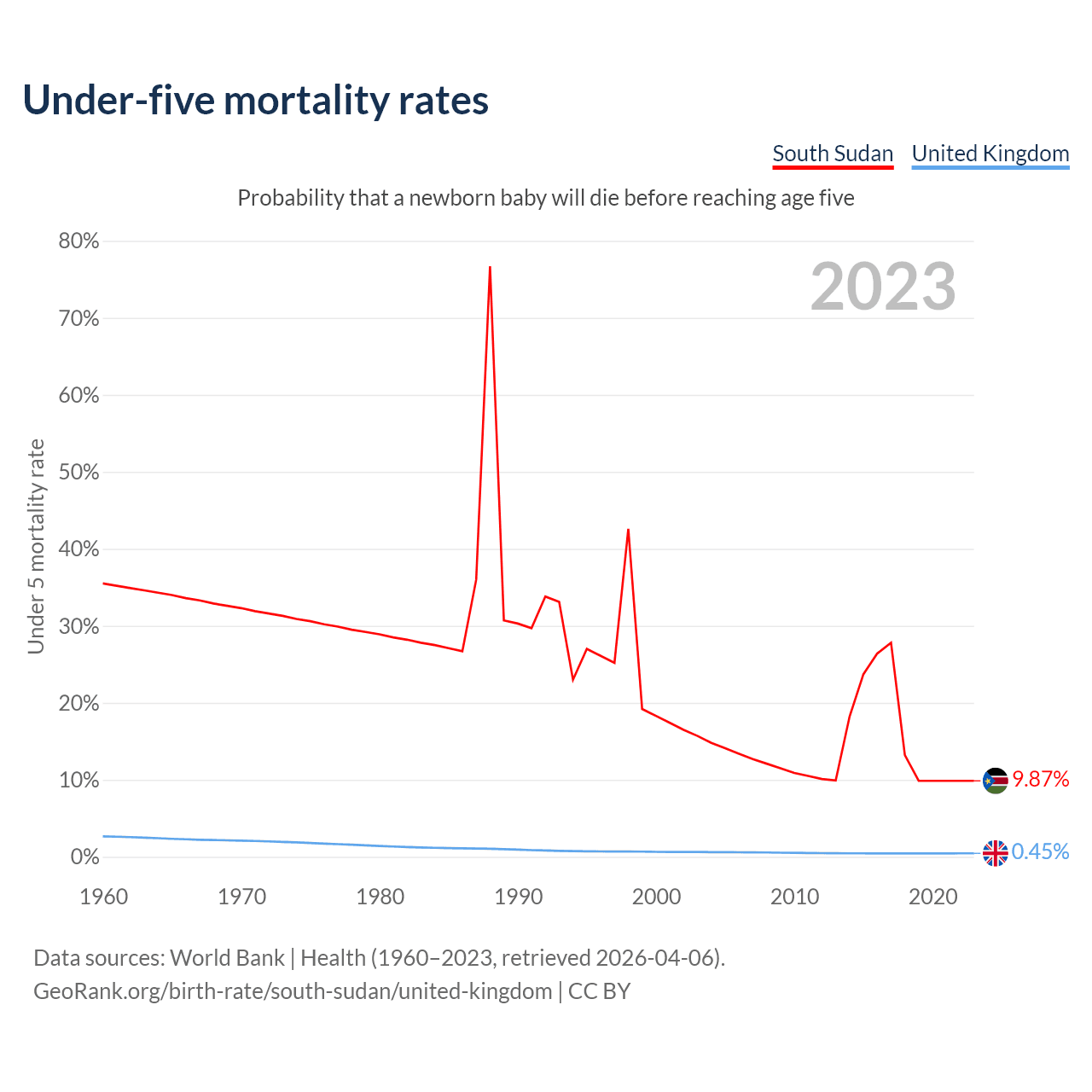 The chance that a newborn baby will die before reaching age five is 9.87% in South Sudan and 0.45% in the United Kingdom. Above is a chart with historical data on under-five mortality rates.