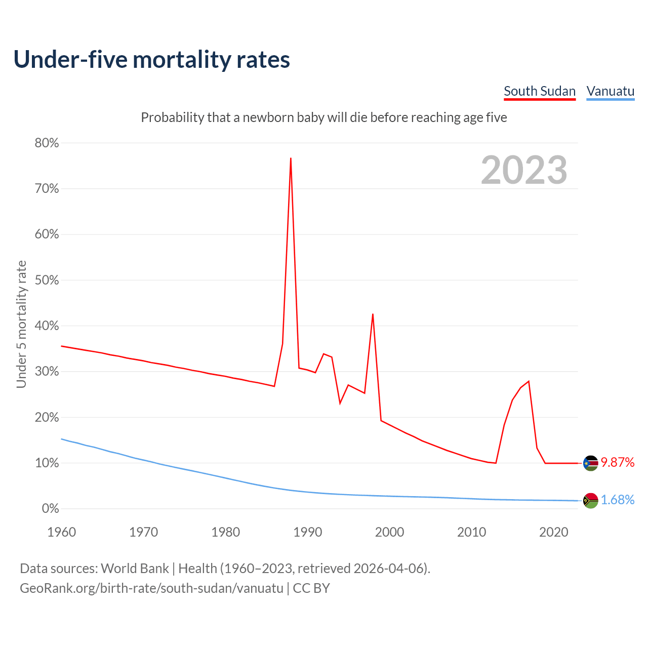 The chance that a newborn baby will die before reaching age five is 9.87% in South Sudan and 1.68% in Vanuatu. Above is a chart with historical data on under-five mortality rates.