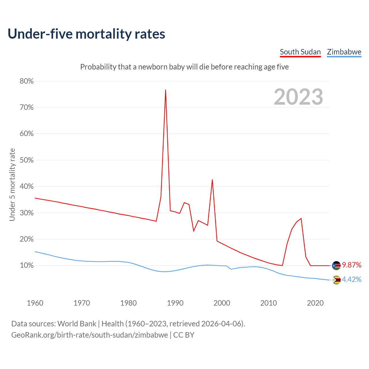 The chance that a newborn baby will die before reaching age five is 9.87% in South Sudan and 4.42% in Zimbabwe. Above is a chart with historical data on under-five mortality rates.