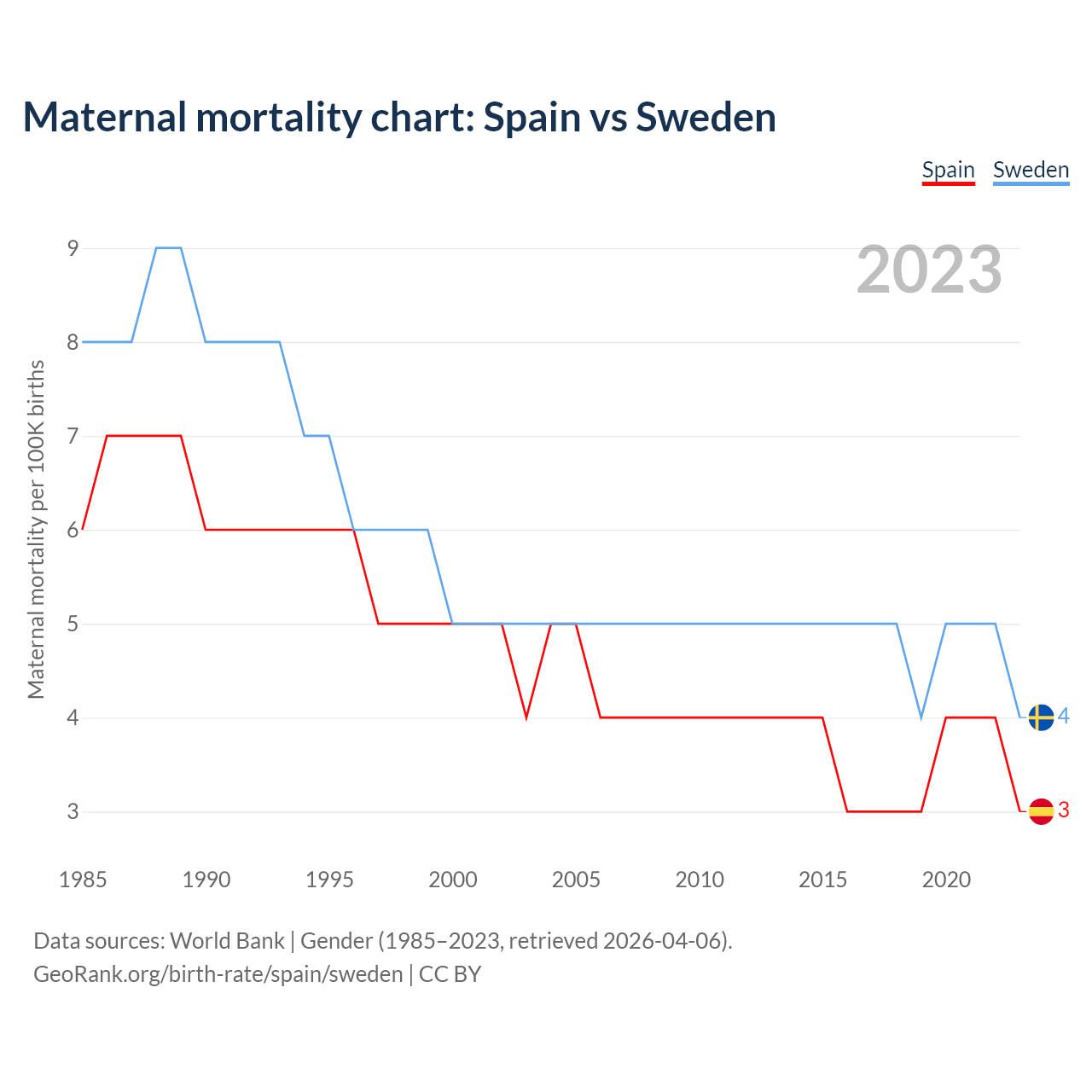 The maternal mortality rate, which is the probability of dying during childbirth or within 42 days of pregnancy termination, is 3 deaths per 100,000 live births in Spain, compared to 4 deaths in Sweden.