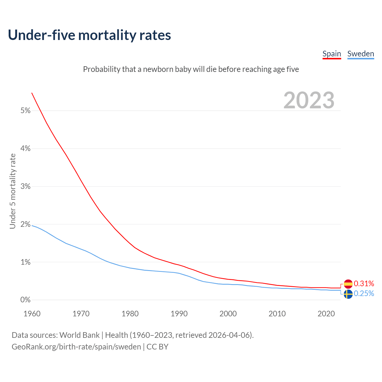 The chance that a newborn baby will die before reaching age five is 0.31% in Spain and 0.25% in Sweden. Above is a chart with historical data on under-five mortality rates.
