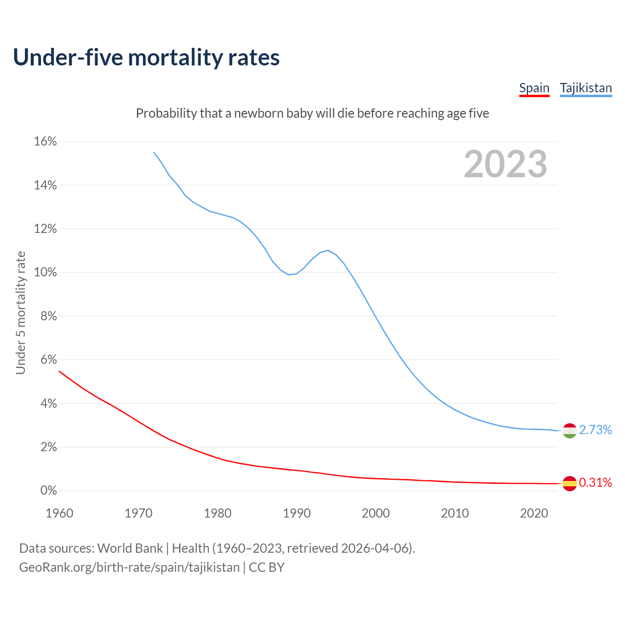 The chance that a newborn baby will die before reaching age five is 0.31% in Spain and 2.73% in Tajikistan. Above is a chart with historical data on under-five mortality rates.
