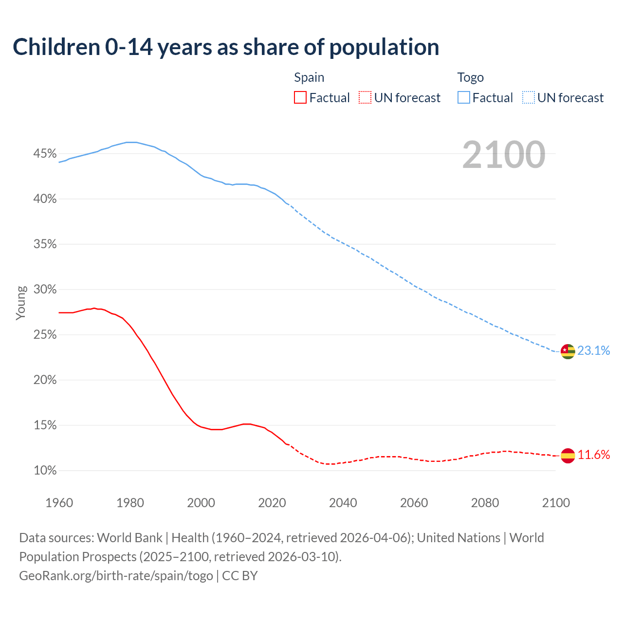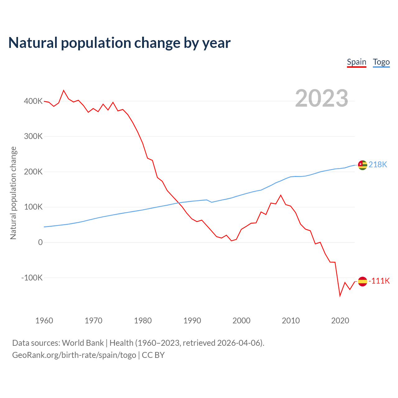 Spain has an annual birth rate of 6.7 births per 1,000 people, compared to 31.1 for Togo. The average number of children a woman is expected to have during her lifetime — the fertility rate, is 1.12 in Spain and 4.19 in Togo — 274.3% difference.