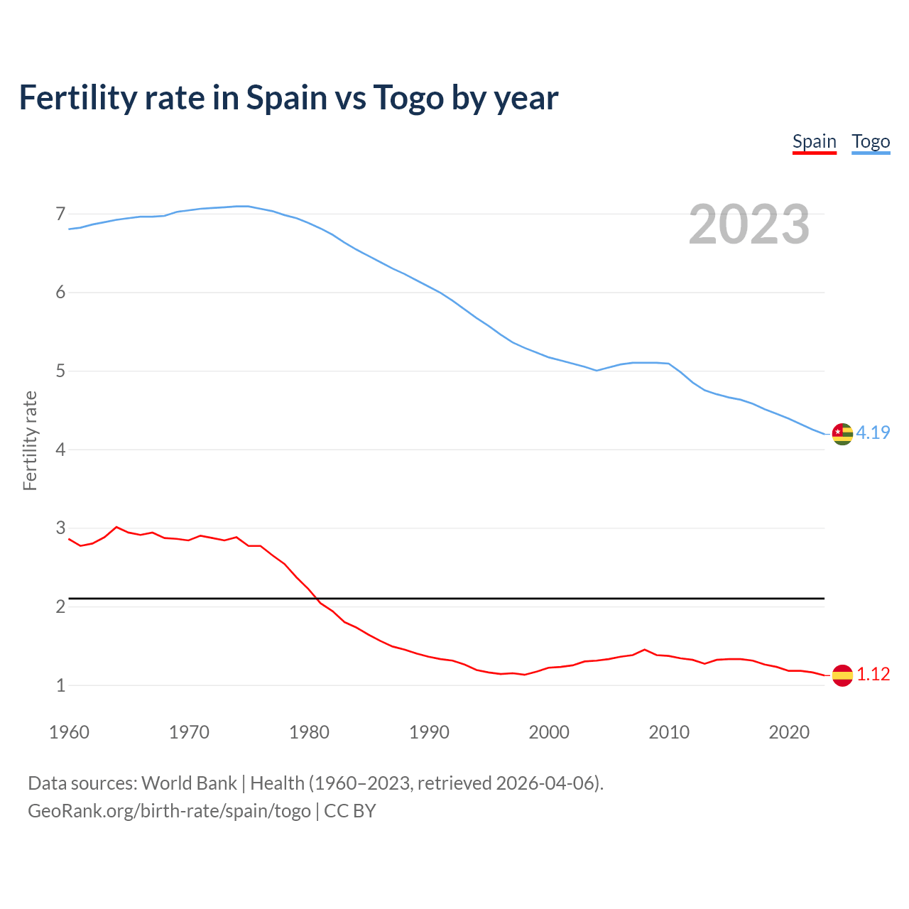 According to the latest available data on birth rates, the fertility rate in Spain was 1.12 children per woman in 2023, compared to 4.19 in Togo in 2023. The replacement level is considered to be 2.1 children per woman.