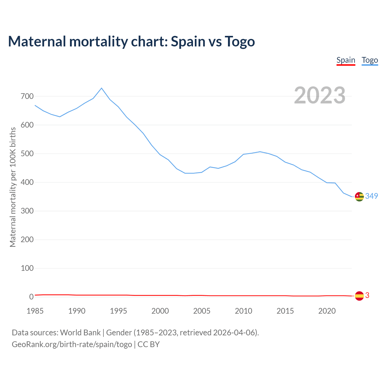 The maternal mortality rate, which is the probability of dying during childbirth or within 42 days of pregnancy termination, is 3 deaths per 100,000 live births in Spain, compared to 349 deaths in Togo.