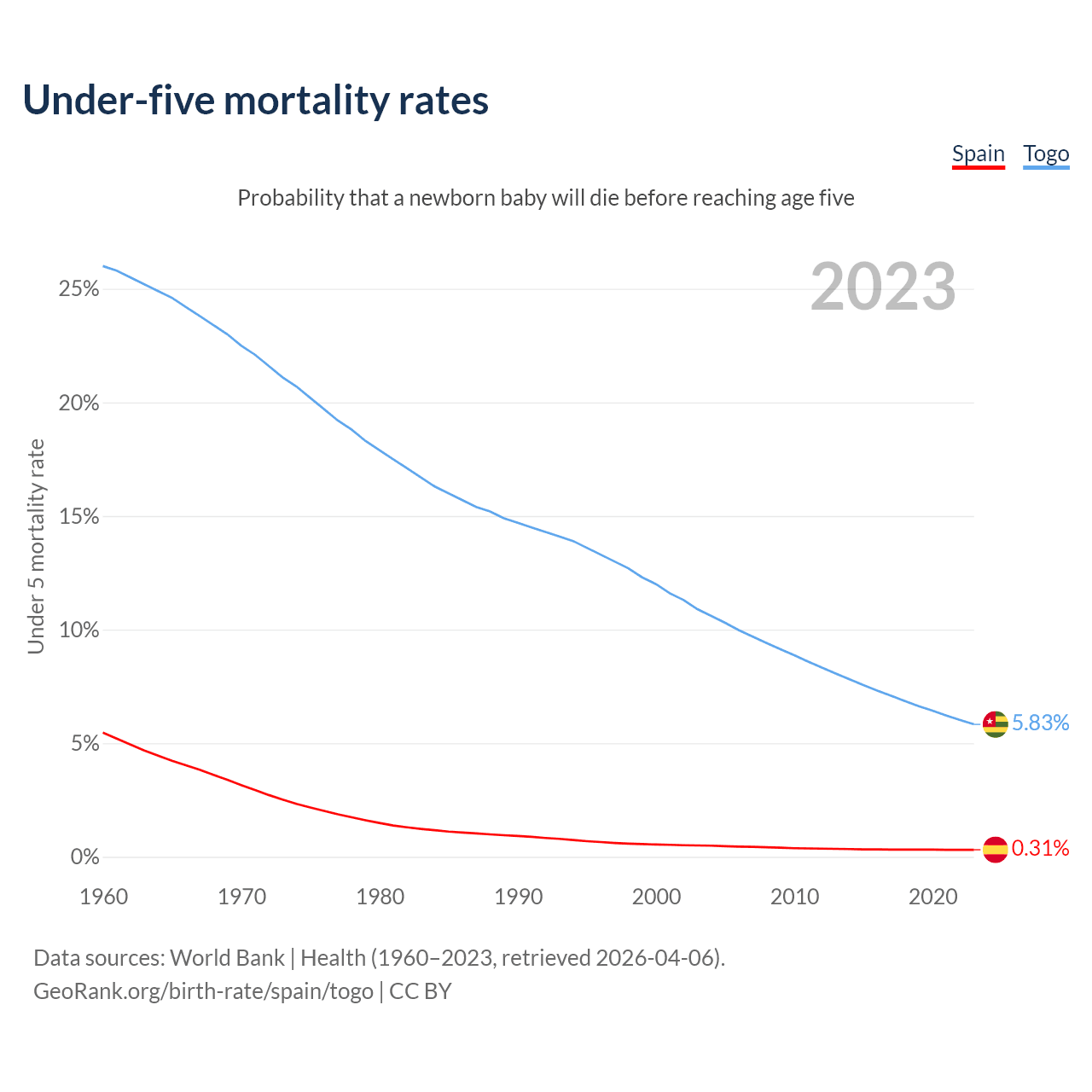 The chance that a newborn baby will die before reaching age five is 0.31% in Spain and 5.83% in Togo. Above is a chart with historical data on under-five mortality rates.