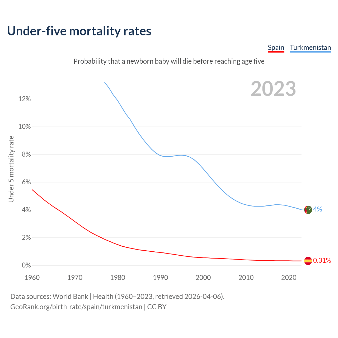 The chance that a newborn baby will die before reaching age five is 0.31% in Spain and 4% in Turkmenistan. Above is a chart with historical data on under-five mortality rates.
