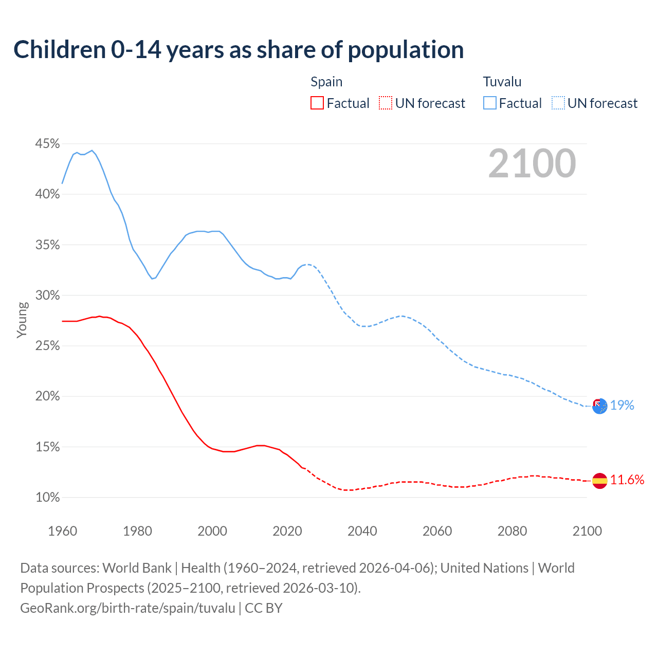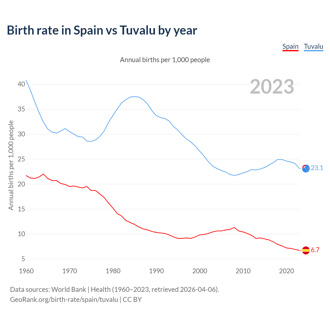 Spain has an annual birth rate of 6.7 births per 1,000 people, compared to 23.1 for Tuvalu. The average number of children a woman is expected to have during her lifetime — the fertility rate, is 1.12 in Spain and 3.21 in Tuvalu — 186.4% difference.