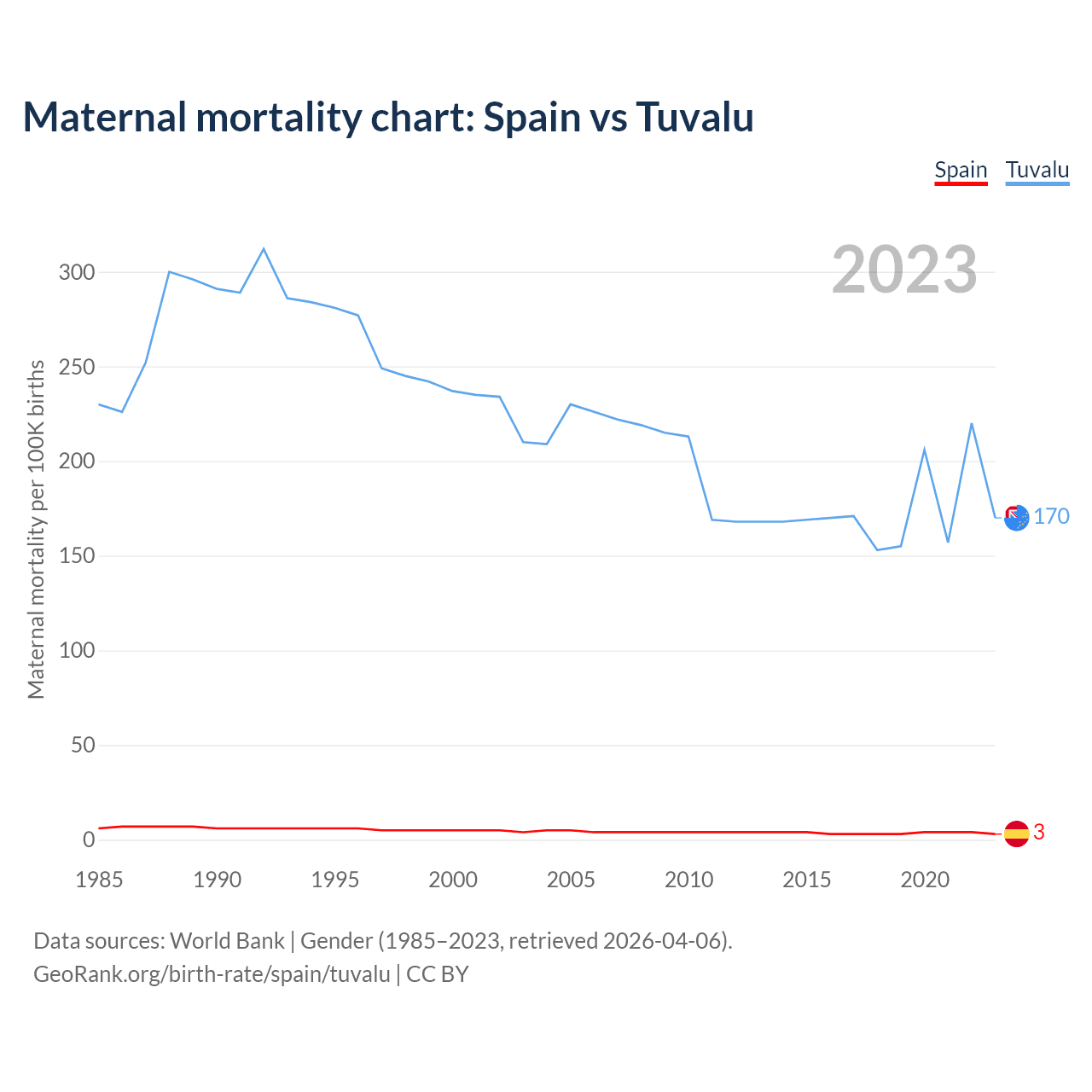 The maternal mortality rate, which is the probability of dying during childbirth or within 42 days of pregnancy termination, is 3 deaths per 100,000 live births in Spain, compared to 170 deaths in Tuvalu.