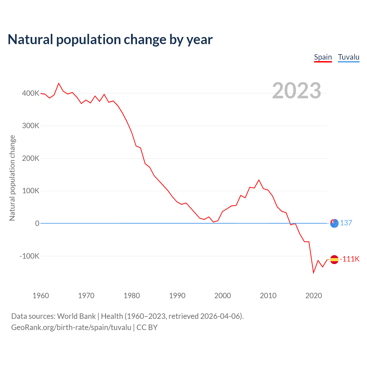 According to the latest available data on birth rates, the fertility rate in Spain was 1.12 children per woman in 2023, compared to 3.21 in Tuvalu in 2023. The replacement level is considered to be 2.1 children per woman.