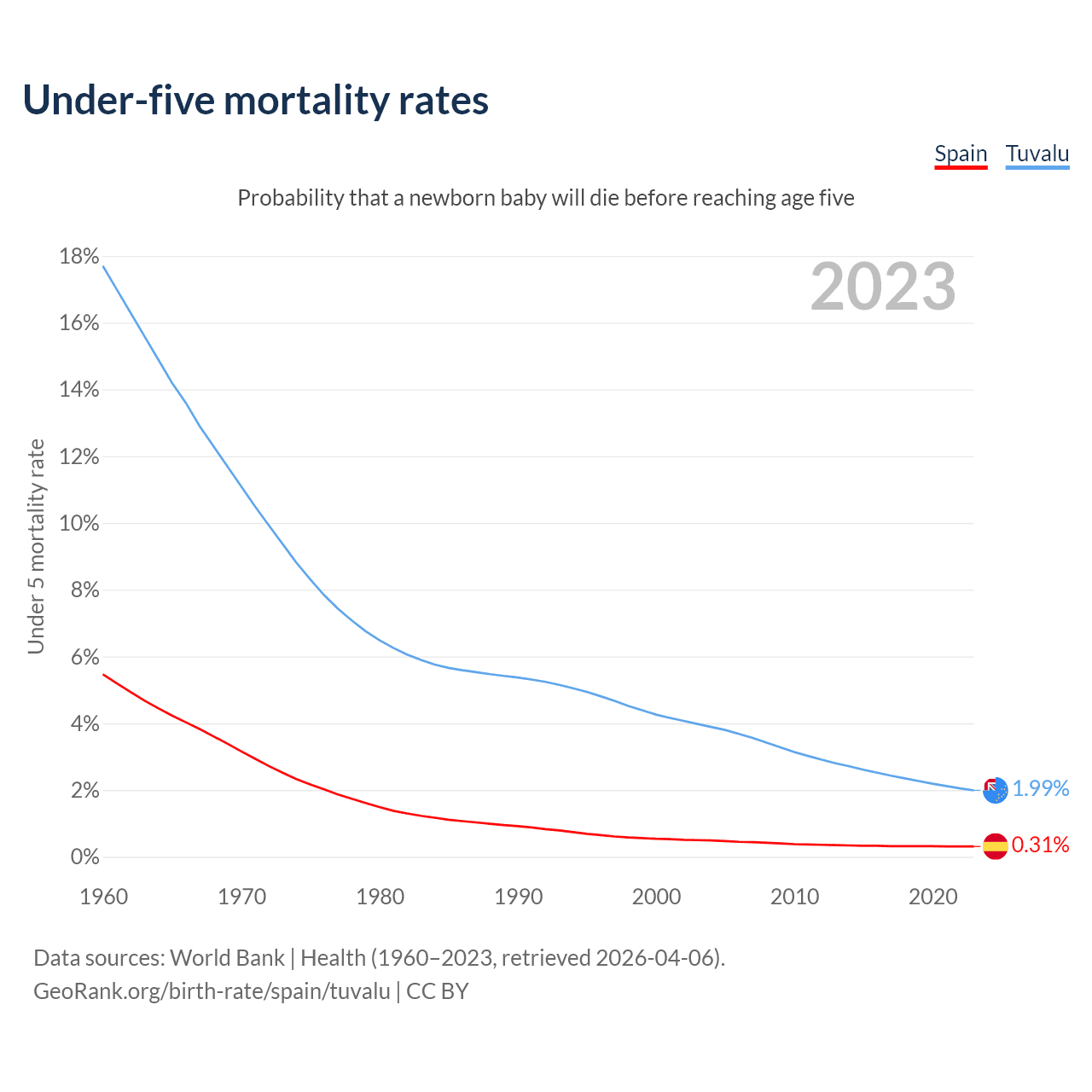 The chance that a newborn baby will die before reaching age five is 0.31% in Spain and 1.99% in Tuvalu. Above is a chart with historical data on under-five mortality rates.