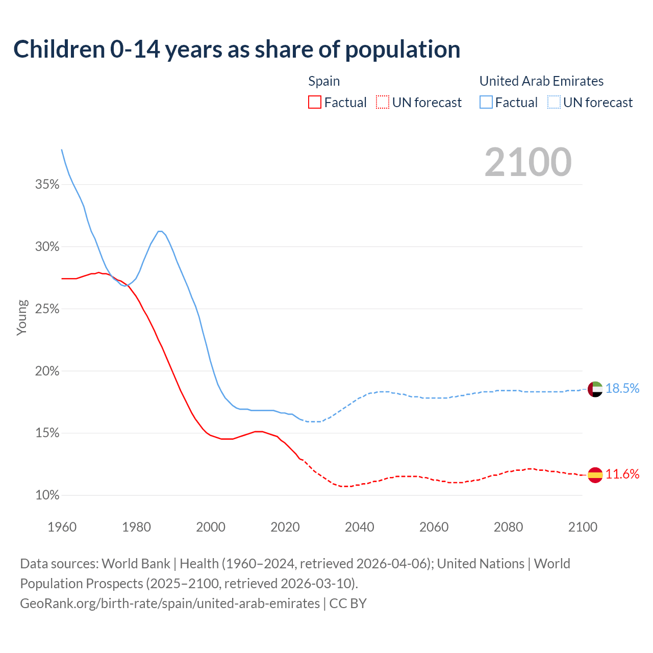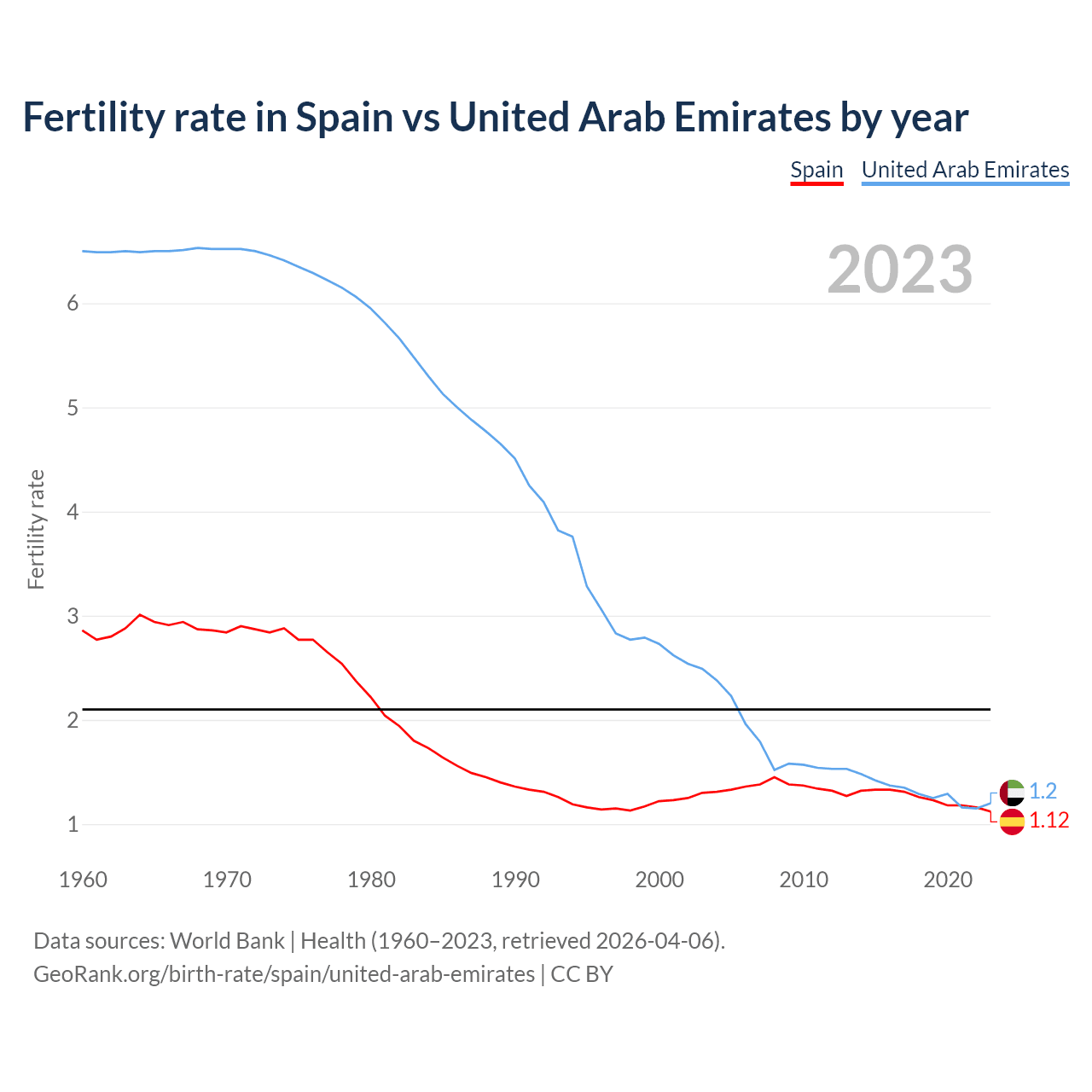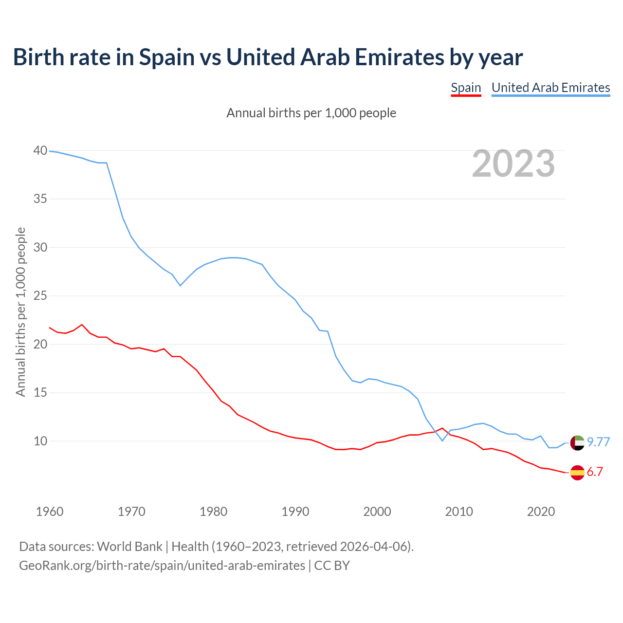 Spain has an annual birth rate of 6.7 births per 1,000 people, compared to 9.77 for the United Arab Emirates. The average number of children a woman is expected to have during her lifetime — the fertility rate, is 1.12 in Spain and 1.2 in the United Arab Emirates — 7.14% difference.