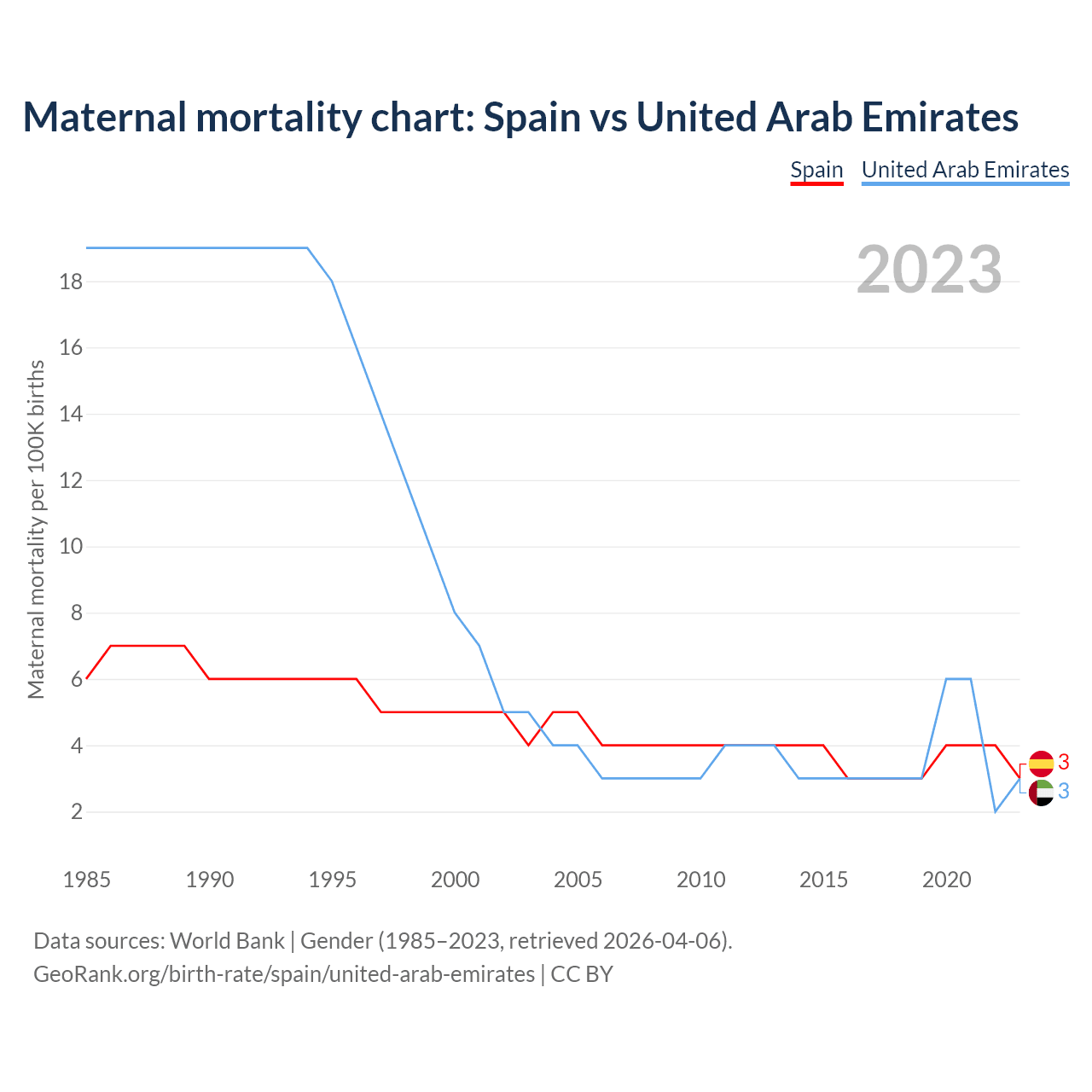 The maternal mortality rate, which is the probability of dying during childbirth or within 42 days of pregnancy termination, is 3 deaths per 100,000 live births in Spain, compared to 3 deaths in the United Arab Emirates.
