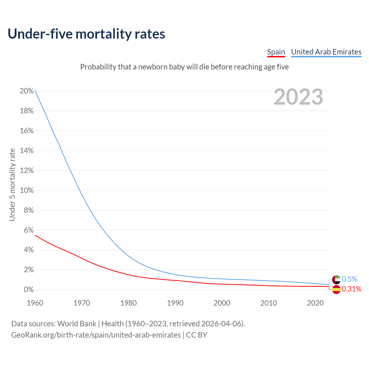 The chance that a newborn baby will die before reaching age five is 0.31% in Spain and 0.5% in the United Arab Emirates. Above is a chart with historical data on under-five mortality rates.