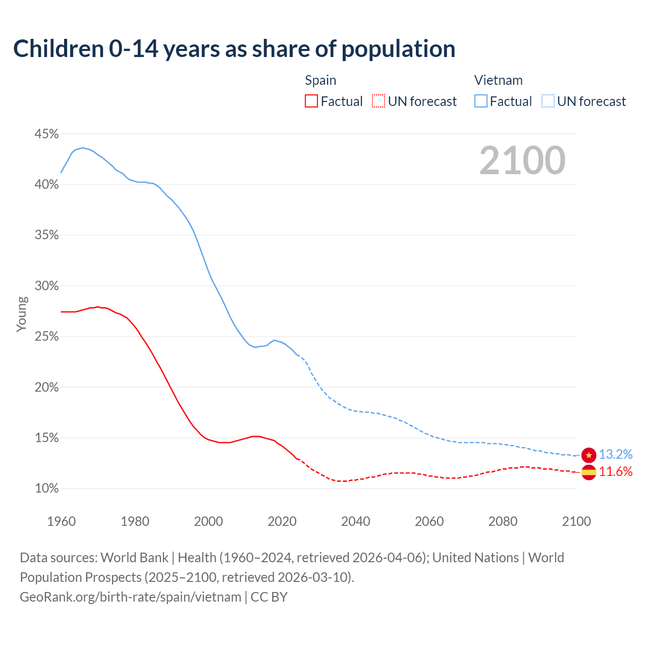 According to the latest available data on birth rates, the fertility rate in Spain was 1.12 children per woman in 2023, compared to 1.91 in Vietnam in 2023. The replacement level is considered to be 2.1 children per woman.