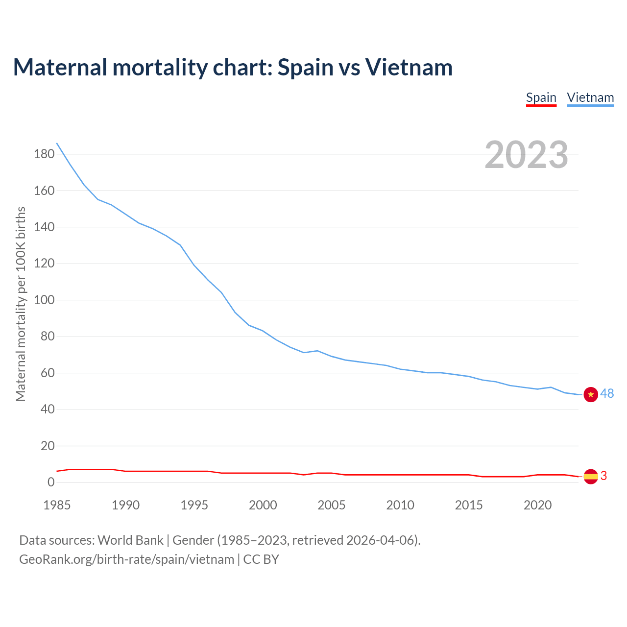 The maternal mortality rate, which is the probability of dying during childbirth or within 42 days of pregnancy termination, is 3 deaths per 100,000 live births in Spain, compared to 48 deaths in Vietnam.
