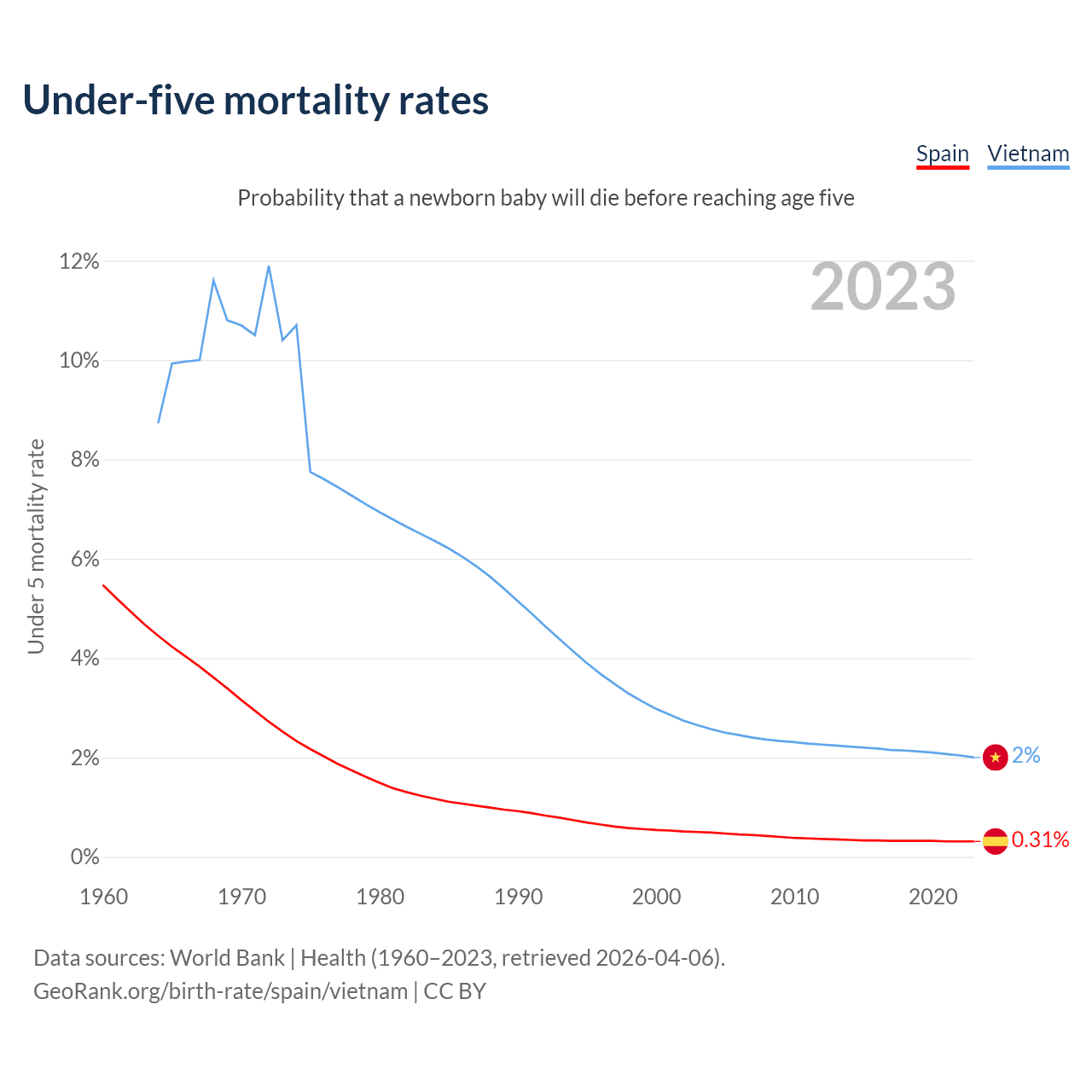 The chance that a newborn baby will die before reaching age five is 0.31% in Spain and 2% in Vietnam. Above is a chart with historical data on under-five mortality rates.