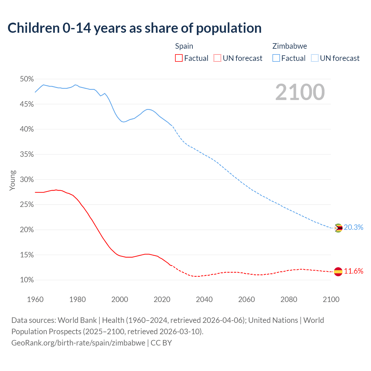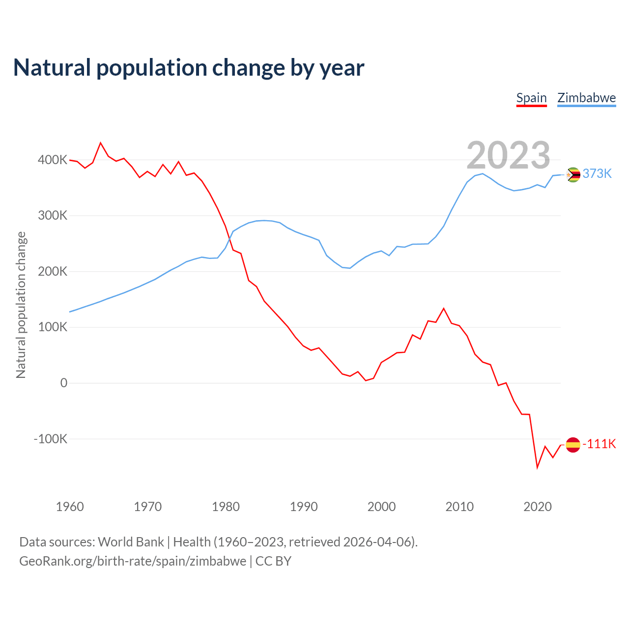 Spain has an annual birth rate of 6.7 births per 1,000 people, compared to 30.4 for Zimbabwe. The average number of children a woman is expected to have during her lifetime — the fertility rate, is 1.12 in Spain and 3.72 in Zimbabwe — 232.5% difference.
