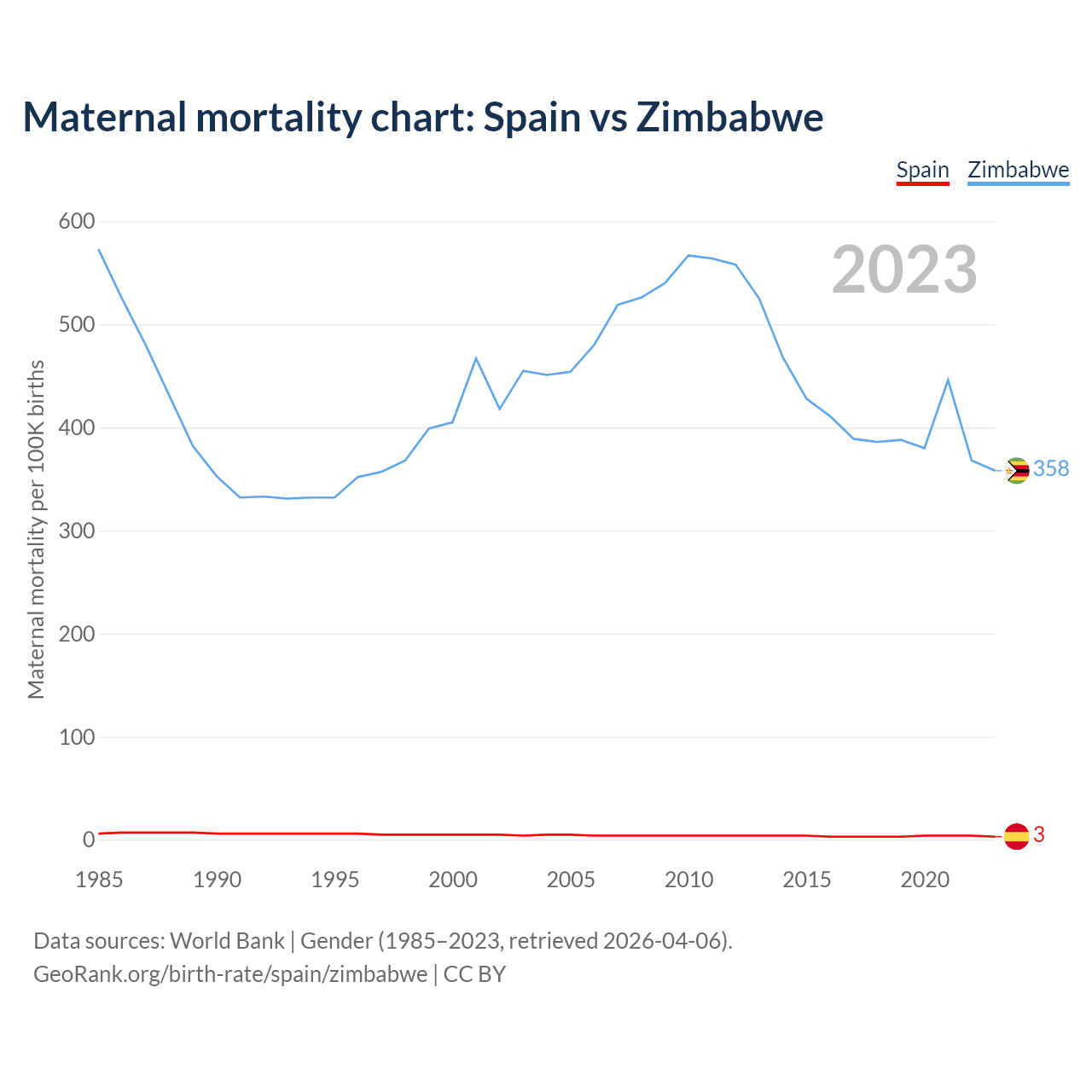 The maternal mortality rate, which is the probability of dying during childbirth or within 42 days of pregnancy termination, is 3 deaths per 100,000 live births in Spain, compared to 358 deaths in Zimbabwe.