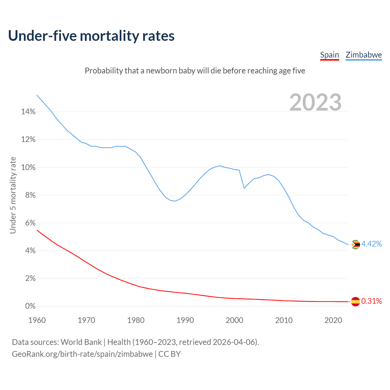 The chance that a newborn baby will die before reaching age five is 0.31% in Spain and 4.42% in Zimbabwe. Above is a chart with historical data on under-five mortality rates.
