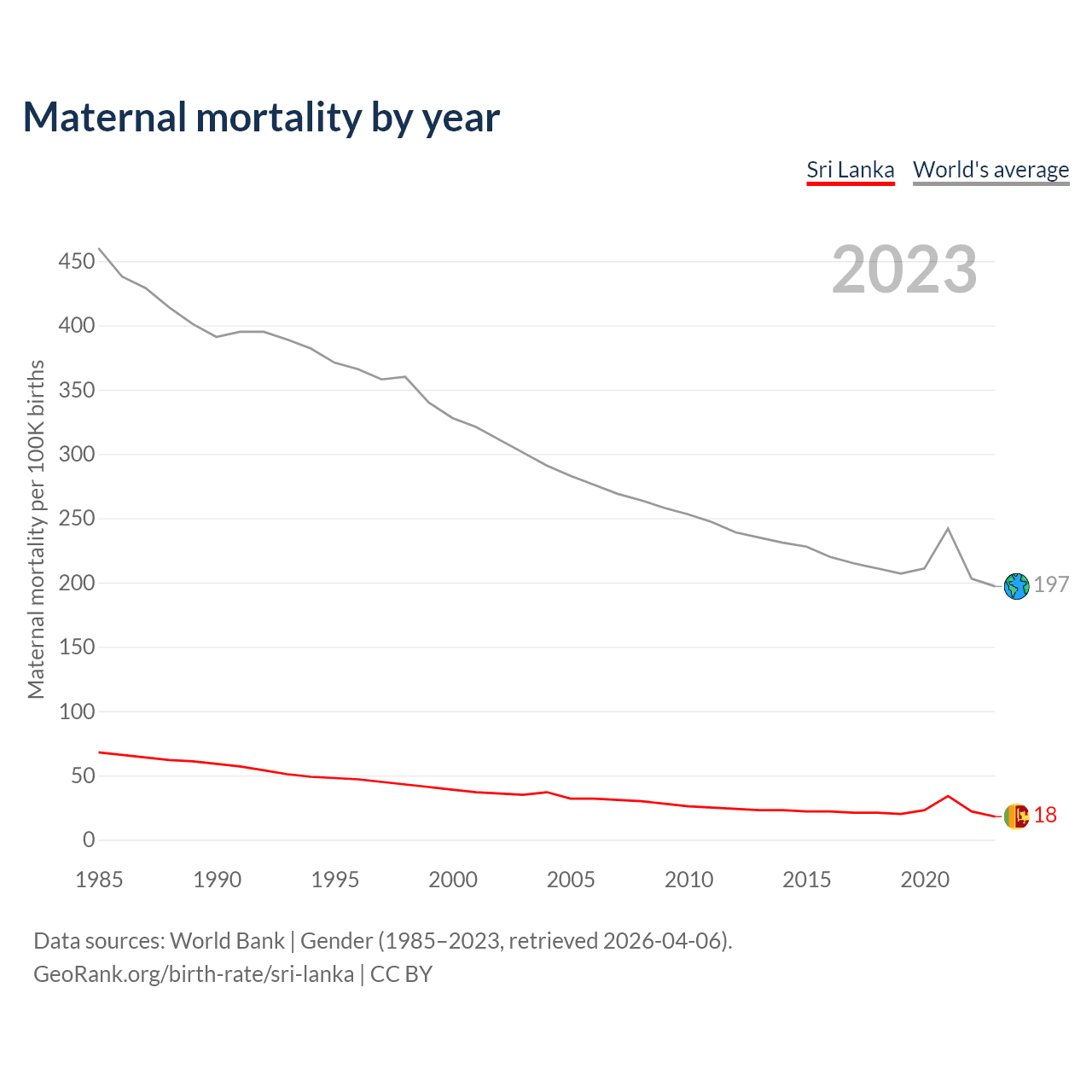 The maternal mortality rate in Sri Lanka was 18 deaths per 100,000 live births in 2023 — a 0.02% chance of dying during childbirth or within 42 days of pregnancy termination. This is a 53.8% decrease compared to the year 2000.