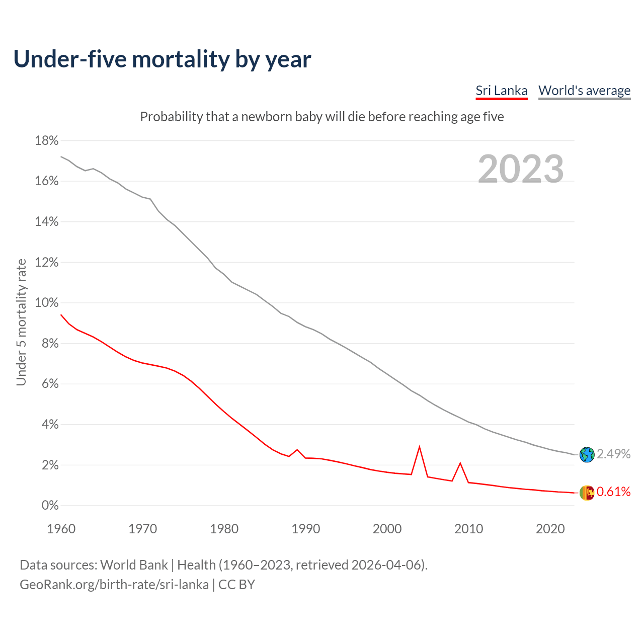 The under-5 mortality rate in Sri Lanka was 6.1 deaths per 1,000 live births in 2023 — a 0.61% chance that a newborn baby will die before reaching age five. This is down from 16.3 deaths per 1,000 live births in 2000.