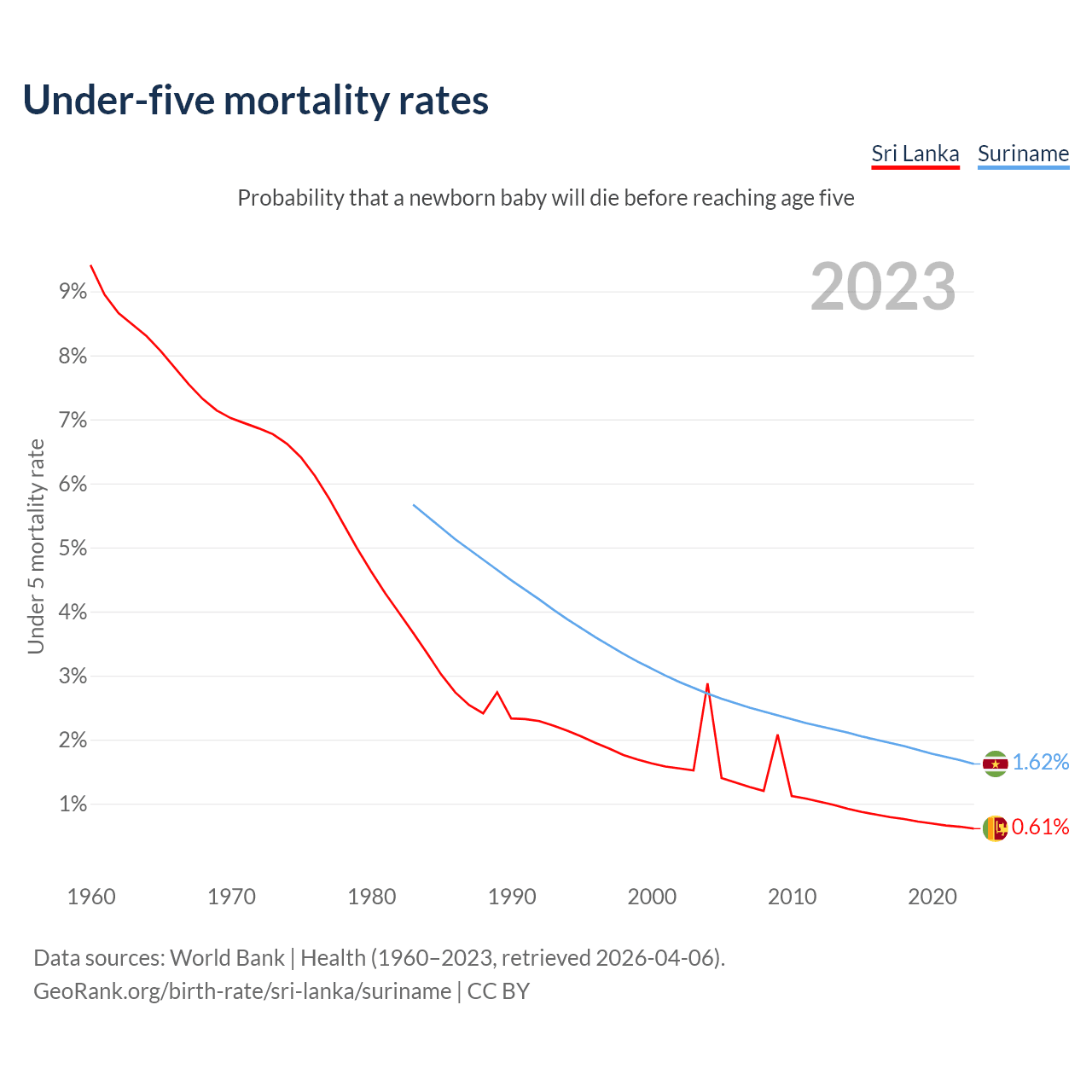 The chance that a newborn baby will die before reaching age five is 0.61% in Sri Lanka and 1.62% in Suriname. Above is a chart with historical data on under-five mortality rates.
