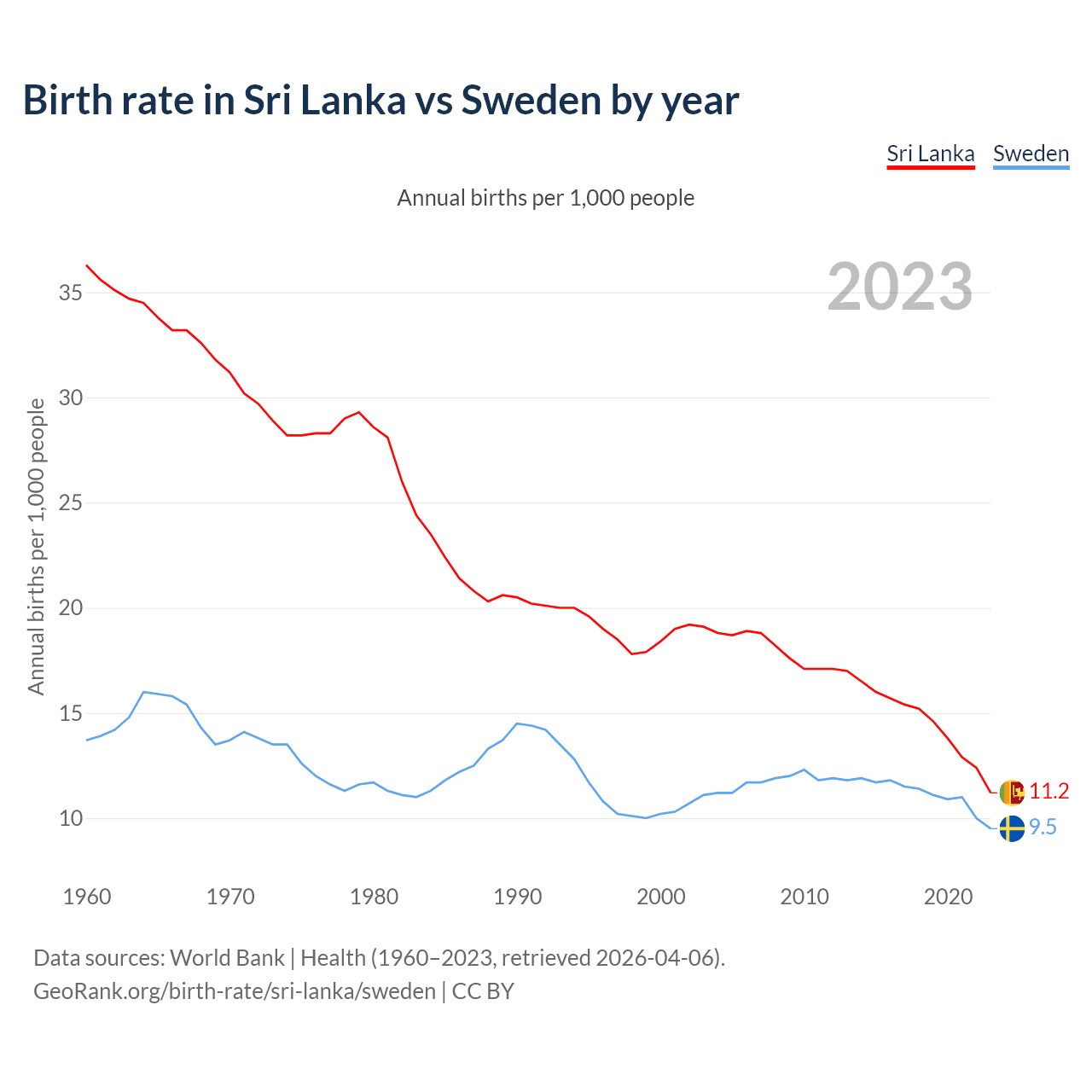According to the latest available data on birth rates, the fertility rate in Sri Lanka was 1.97 children per woman in 2023, compared to 1.45 in Sweden in 2023. The replacement level is considered to be 2.1 children per woman.