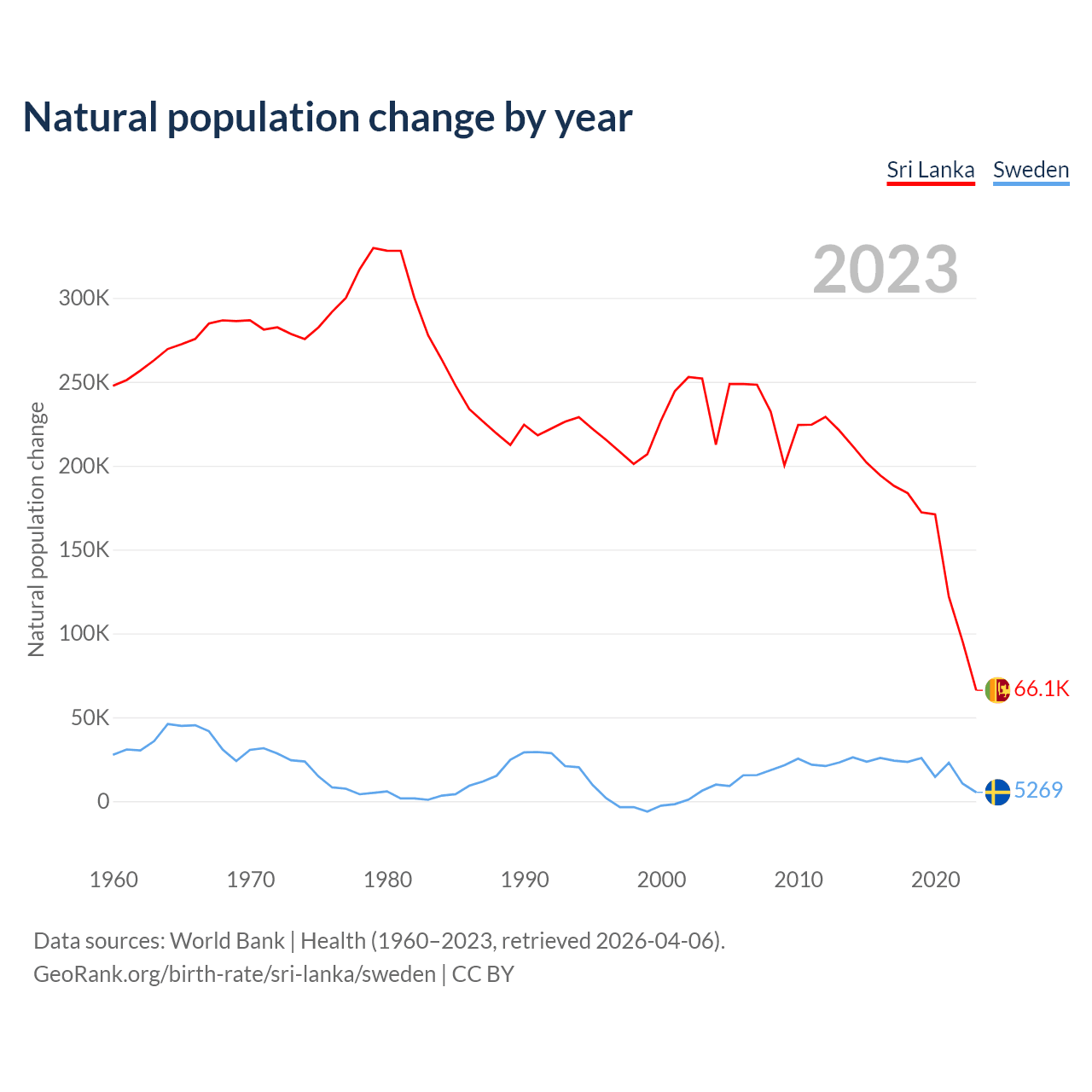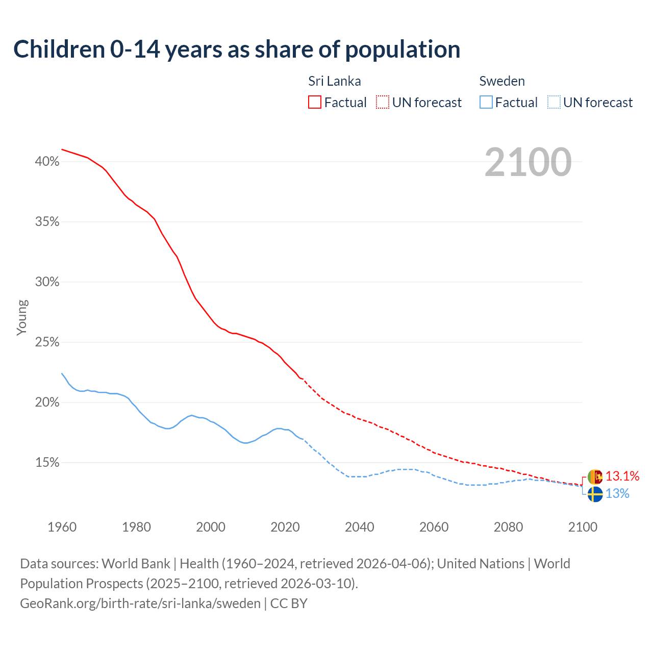 Sri Lanka has an annual birth rate of 11.2 births per 1,000 people, compared to 9.5 for Sweden. The average number of children a woman is expected to have during her lifetime — the fertility rate, is 1.97 in Sri Lanka and 1.45 in Sweden — 26.5% difference.