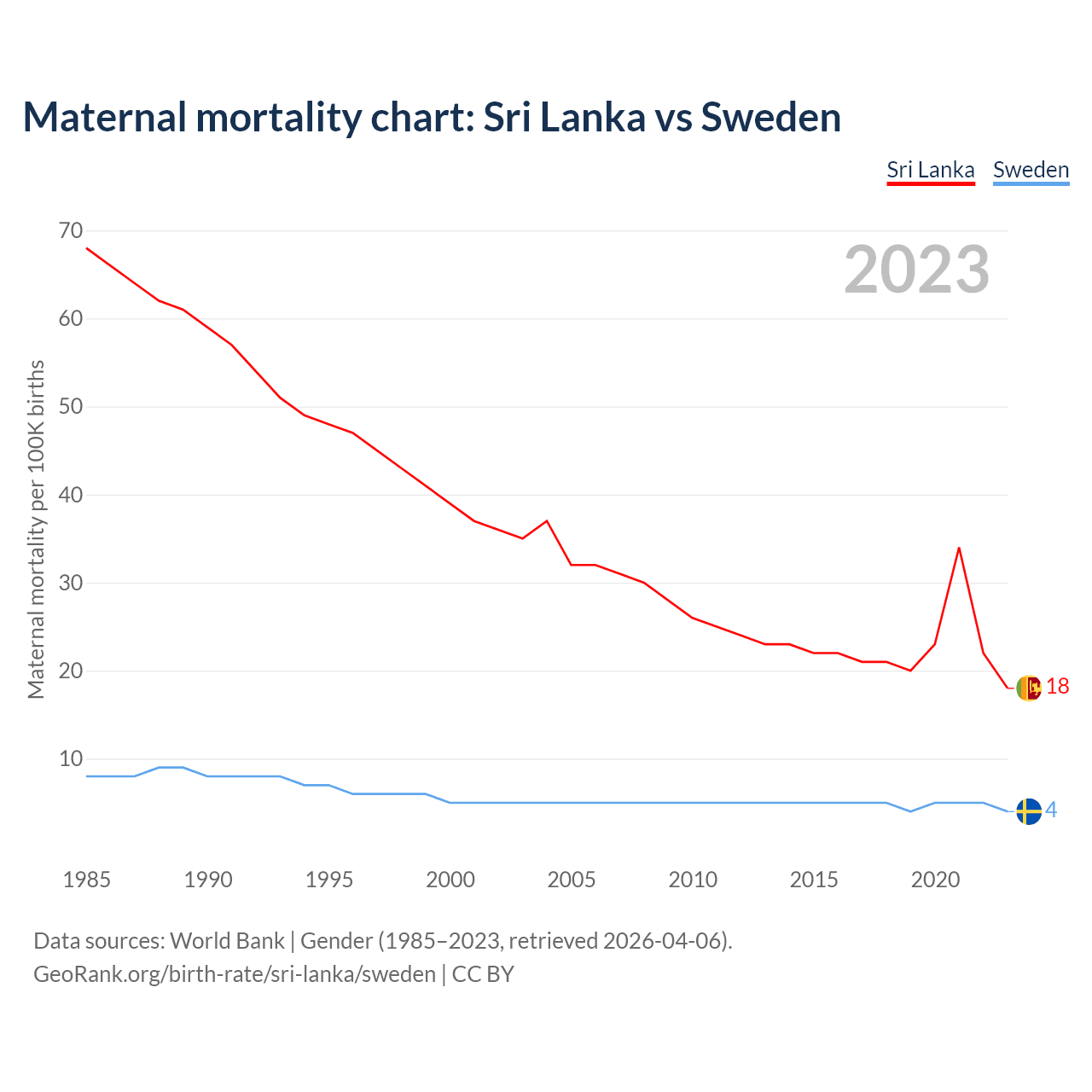 The maternal mortality rate, which is the probability of dying during childbirth or within 42 days of pregnancy termination, is 18 deaths per 100,000 live births in Sri Lanka, compared to 4 deaths in Sweden.